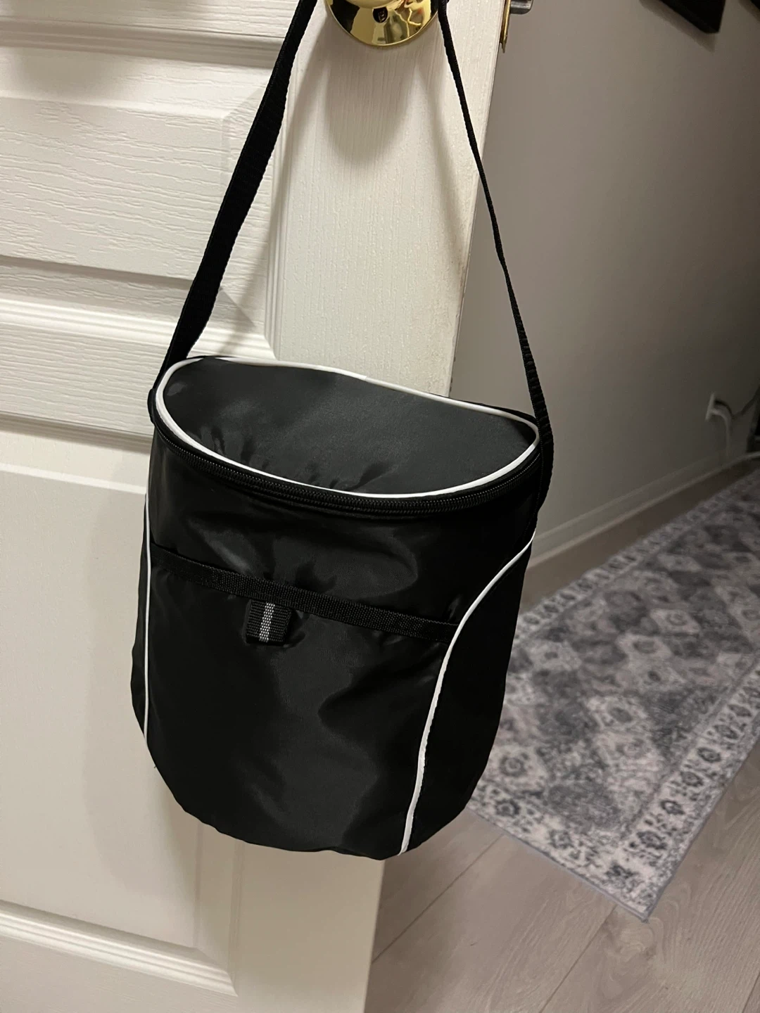 Selling a black insulated lunch bag in excellent condition! It features a convenient shoulder strap and a small front pocket. Perfect for keeping your lunch cool on the go