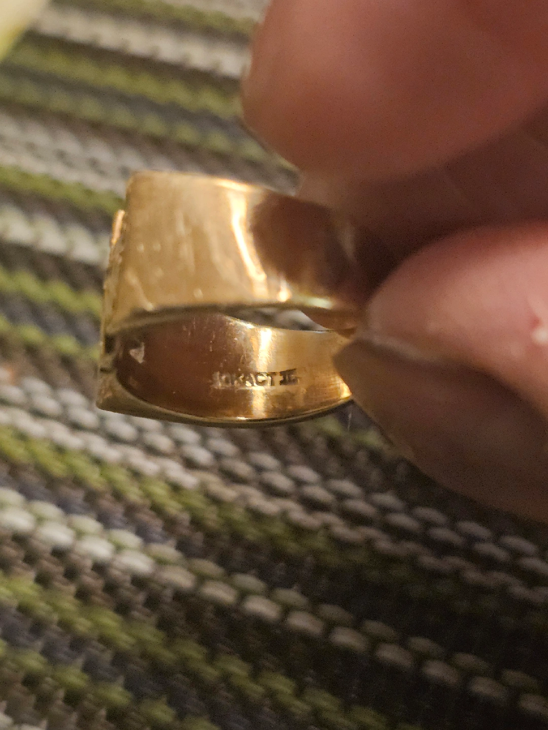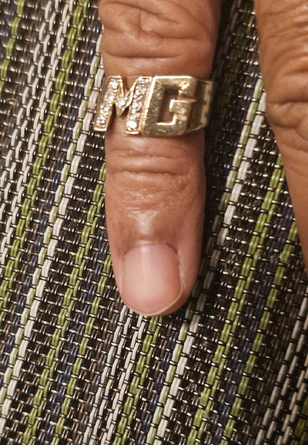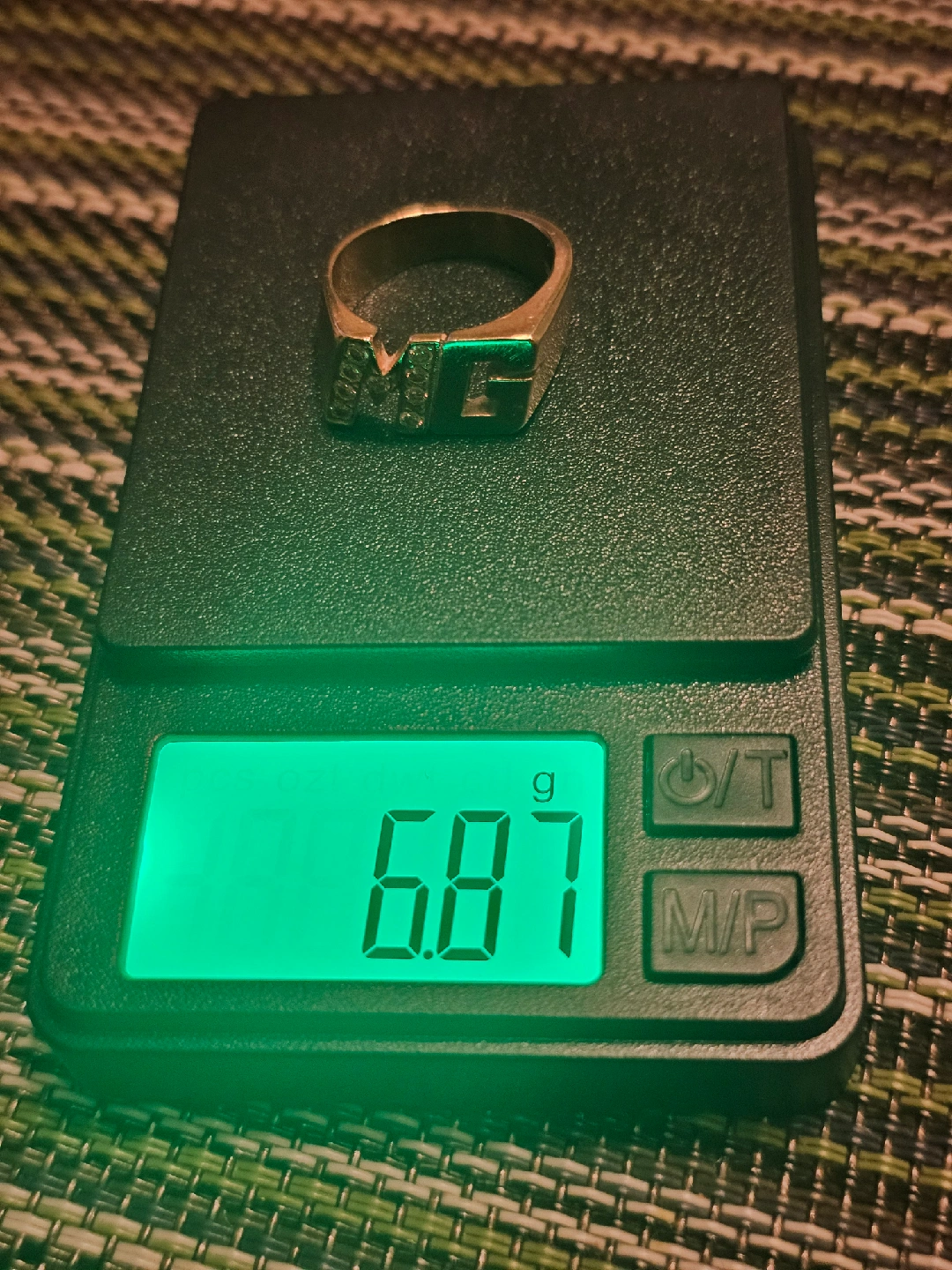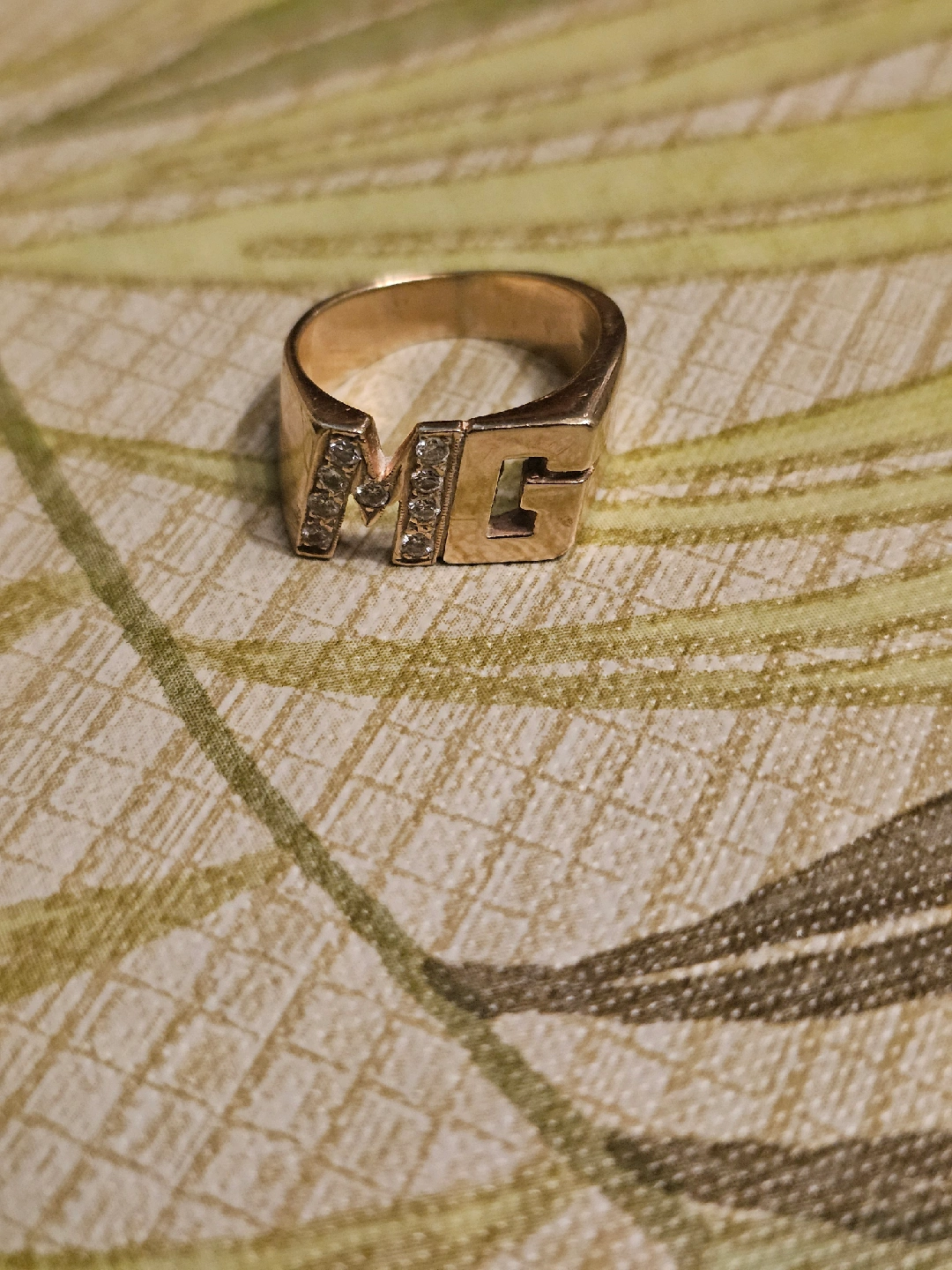 Selling a 10K gold ring with an 'MG' initial design. The ring weighs 6.87 grams and features small stones set within the initials. It's a unique piece in good condition!