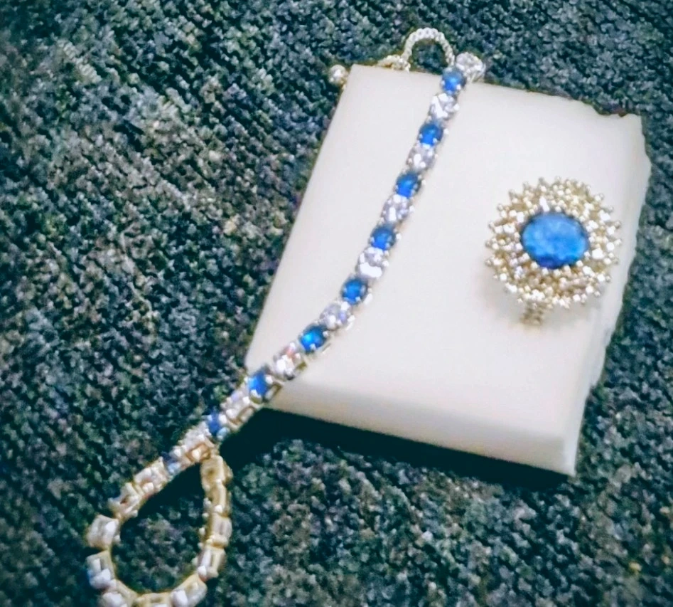 A sparkly bracelet and ring set featuring blue and clear stones. The bracelet has a delicate chain with alternating stones. The ring has a striking blue center stone surrounded by smaller clear stones. It's a lovely set for adding a touch of glamour!