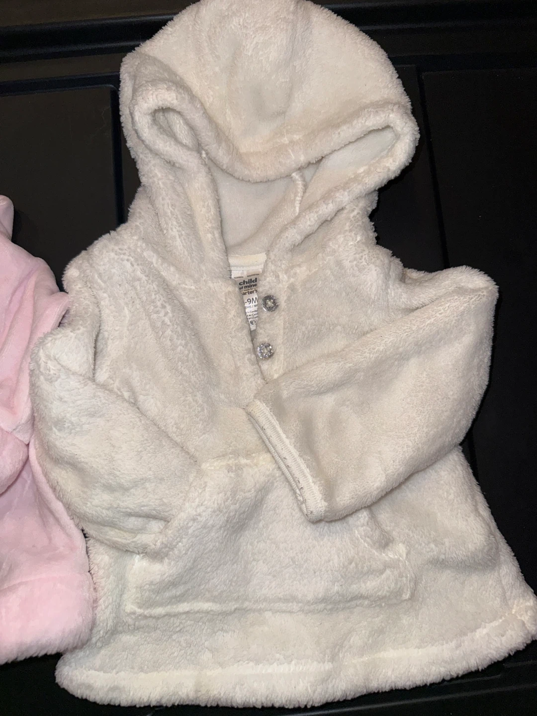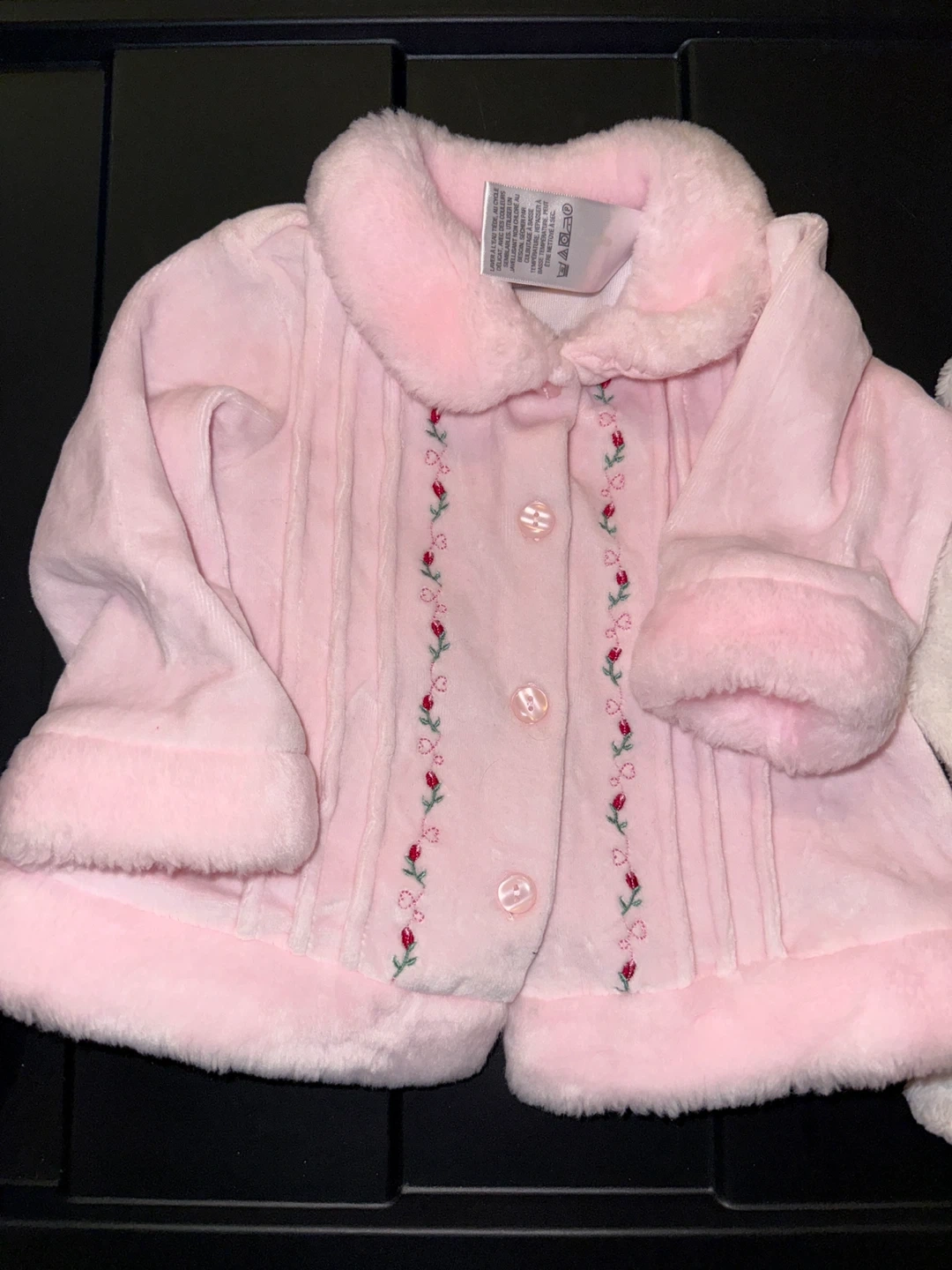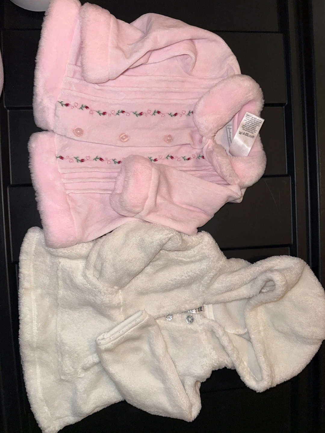 Two adorable baby jackets from Child of Mine, size 9M. One is a soft, fluffy white, and the other is a sweet pink with floral embroidery. Perfect for keeping your little one cozy!