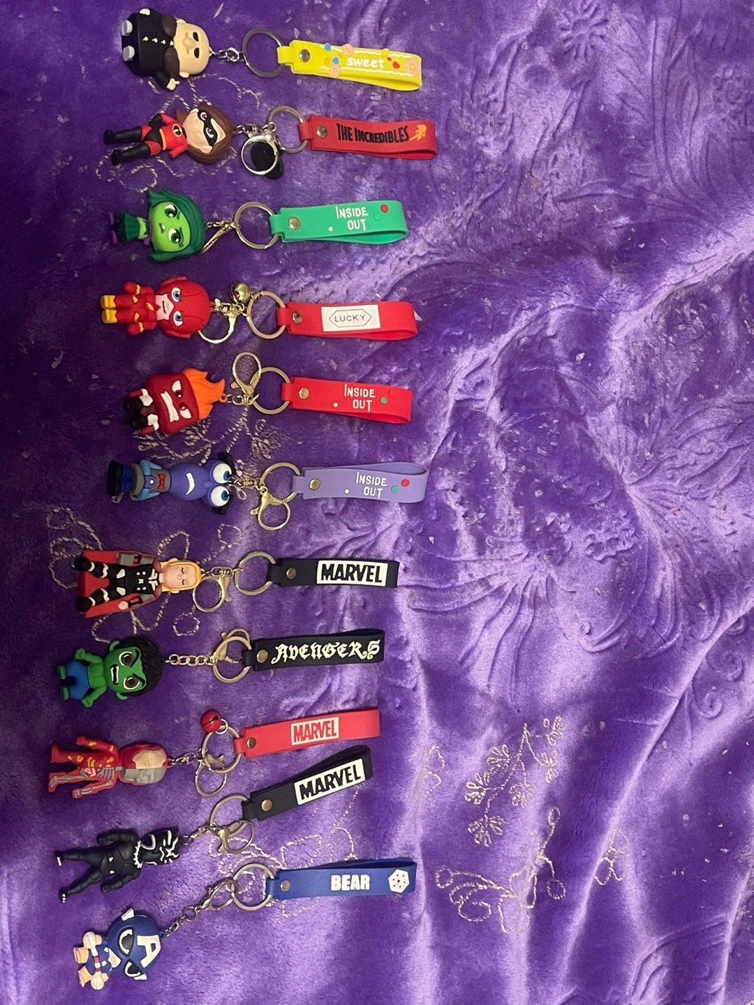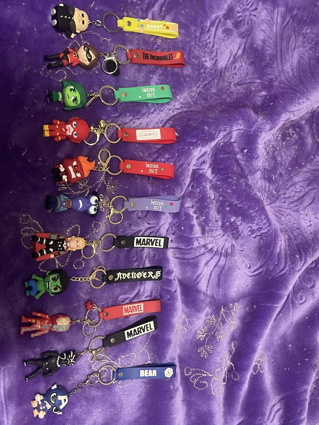 Selling a variety of character keychains! There's Marvel Avengers, The Incredibles, and Inside Out characters. They're all in great shape and ready to add some fun to your keys or backpack