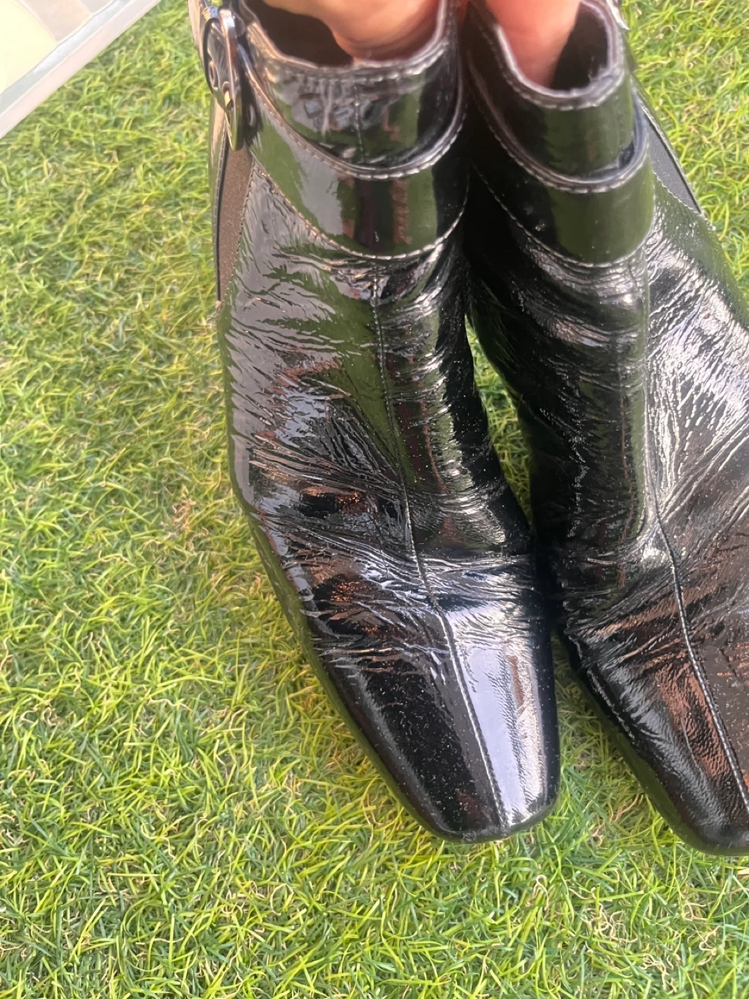 Selling a pair of Robert cappucci ankle boots in black patent leather. They feature a stylish buckle detail and a comfortable heel. These boots are perfect for adding a touch of elegance to any outfit!
