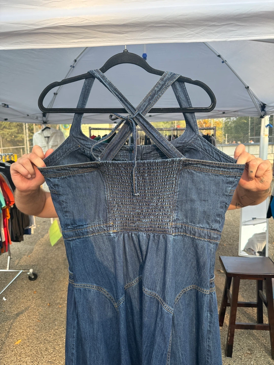 72This is a lovely denim dress from Pilcro! It's a size large and features button-down detailing and a flattering fit. The material is durable and perfect for casual wear. It's in great condition and ready for a new home