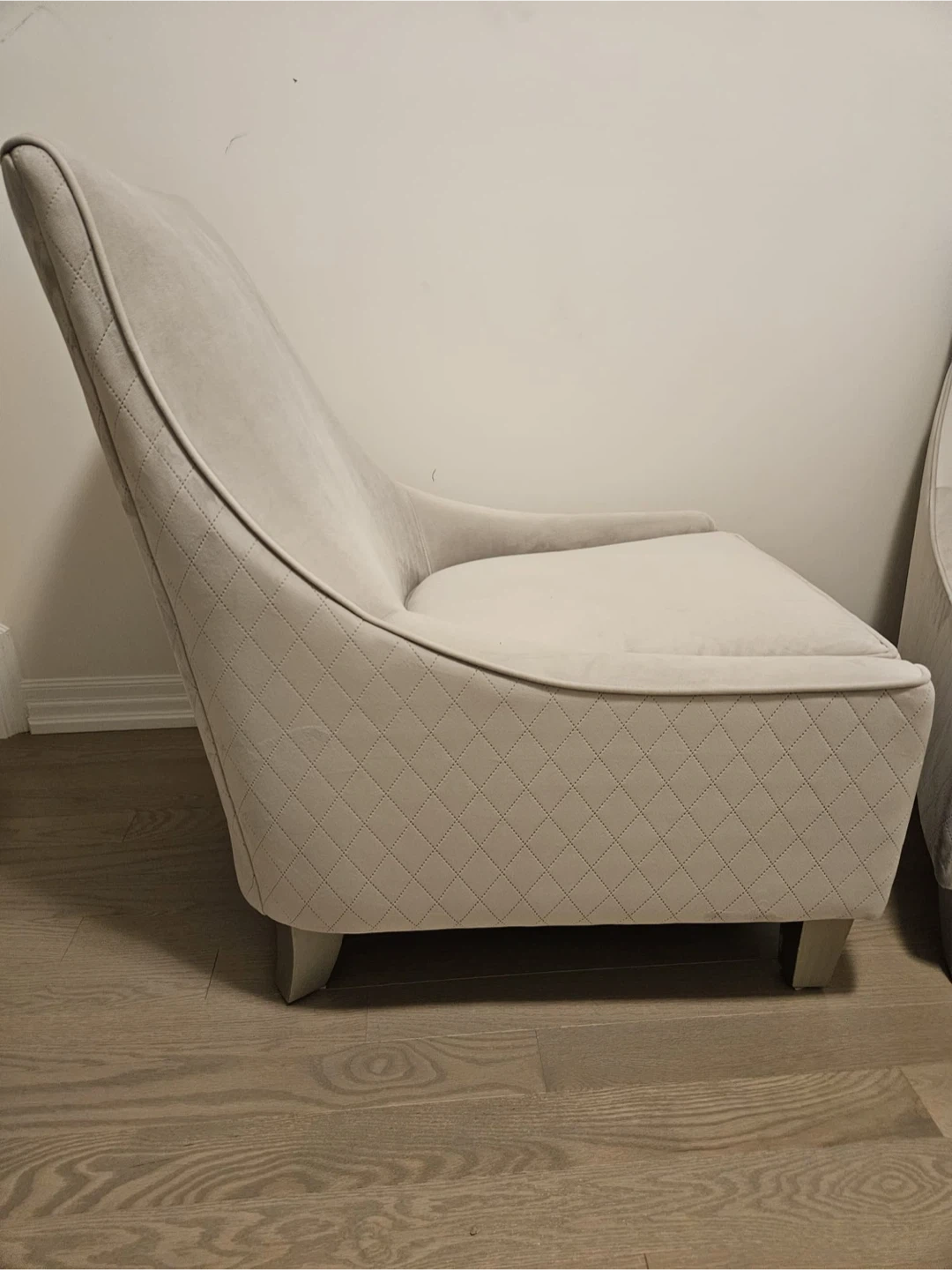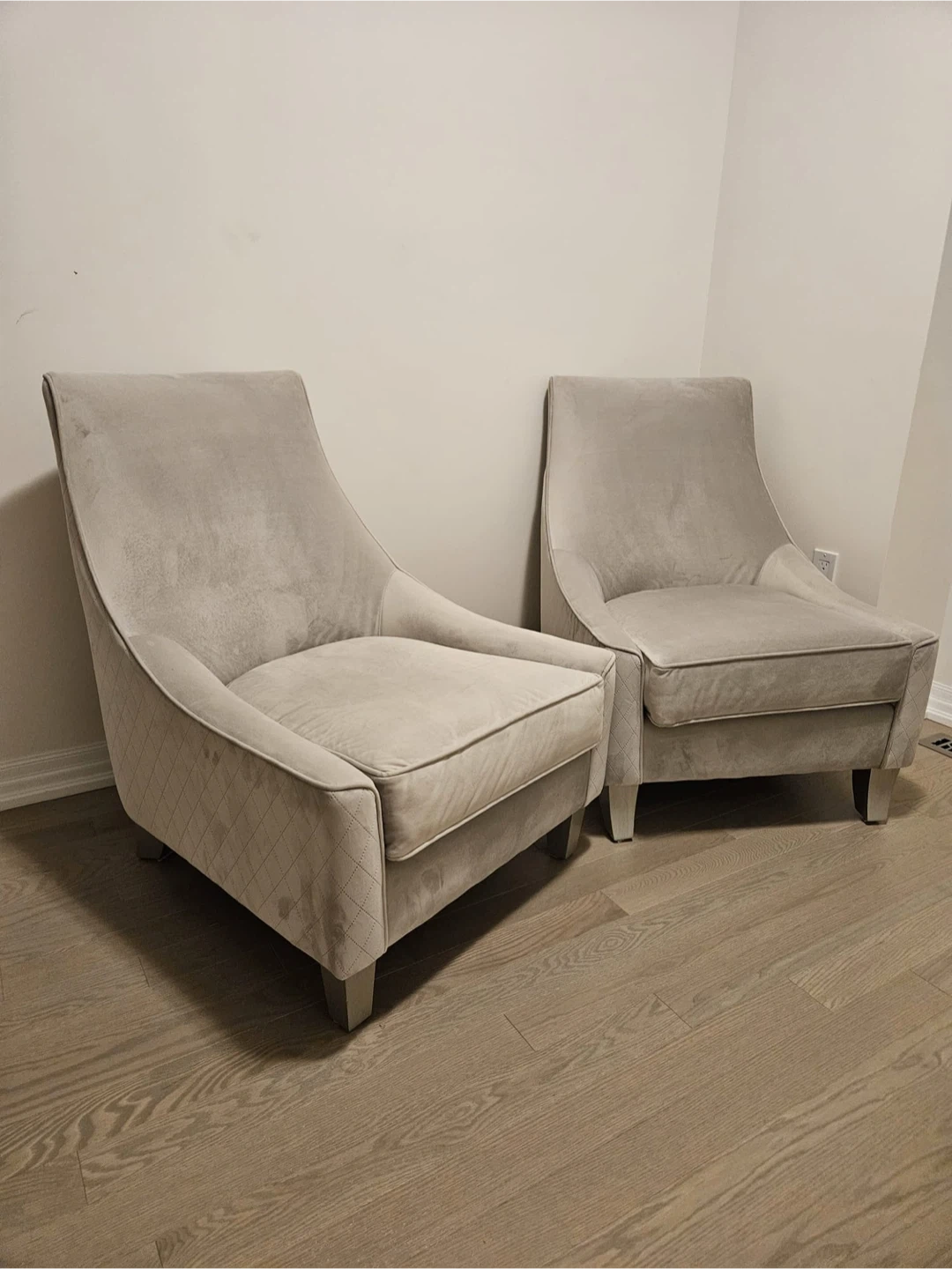 Selling a set of two lovely accent chairs. They feature a light grey colour and a quilted design on the sides and back. Perfect for adding a touch of elegance to any room!
