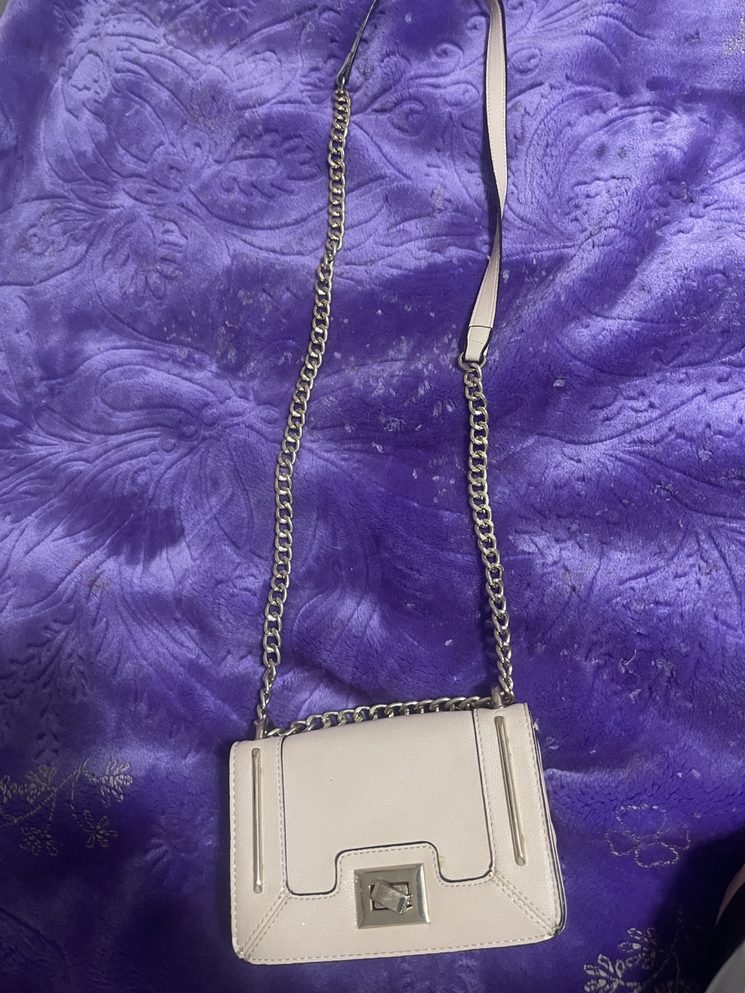 Cute light pink crossbody bag from Aldo! It has a silver chain strap and a unique clasp. Perfect for a night out or just running errands around town