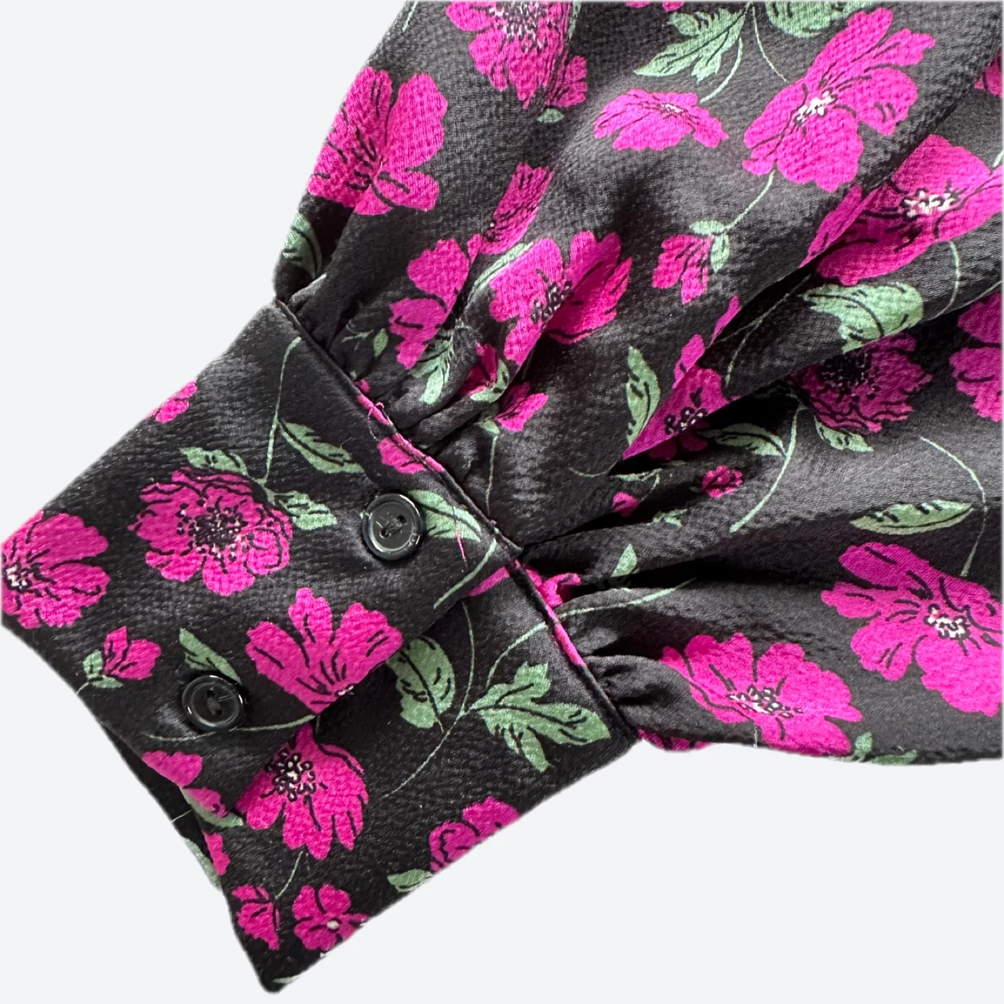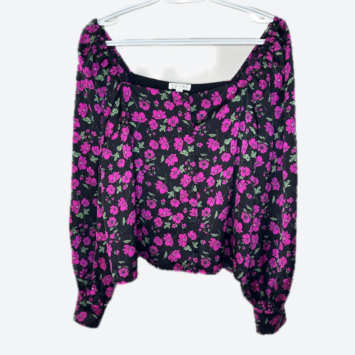 This is an Anthropologie Leith floral blouse in size L. It features a square neckline and long sleeves with elastic cuffs. The blouse has a black background with pink floral pattern