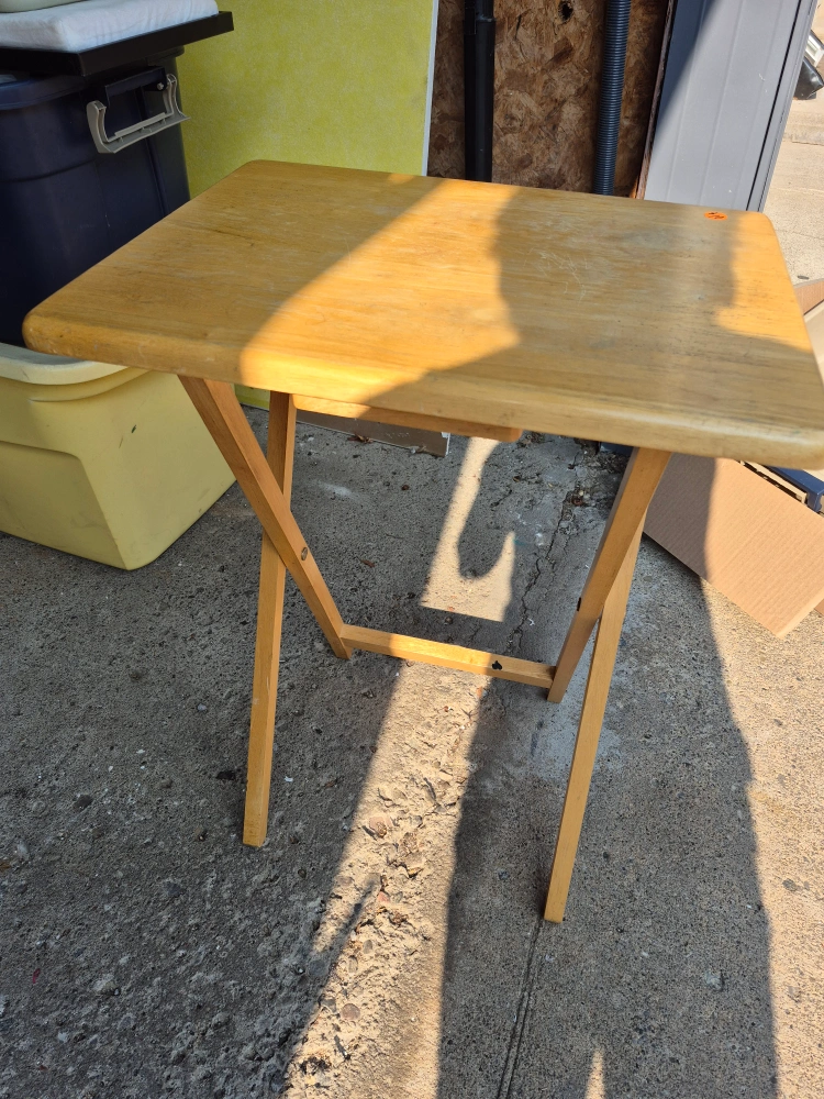 Selling a wooden folding side table. It's perfect for small spaces and easy to store when not in use. It has a natural wood finish and a simple, classic design. It's in good condition and ready for a new home