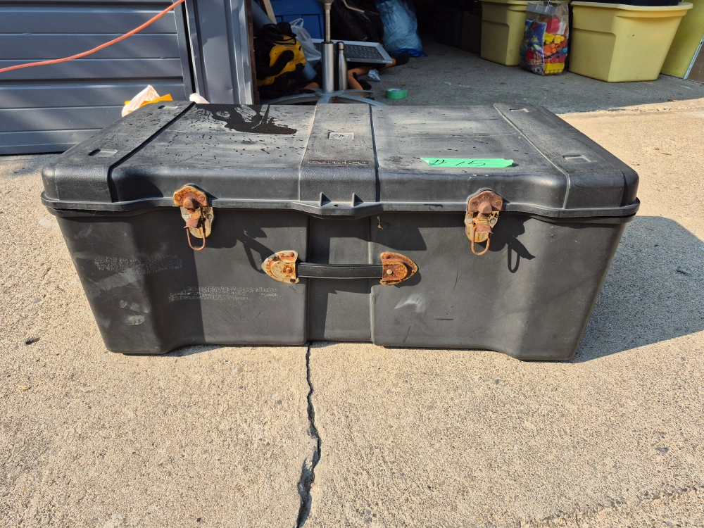 Selling a black plastic storage trunk! It's in used condition, showing some signs of wear, but still functional for storing your items. Great for organizing your garage, basement, or outdoor space