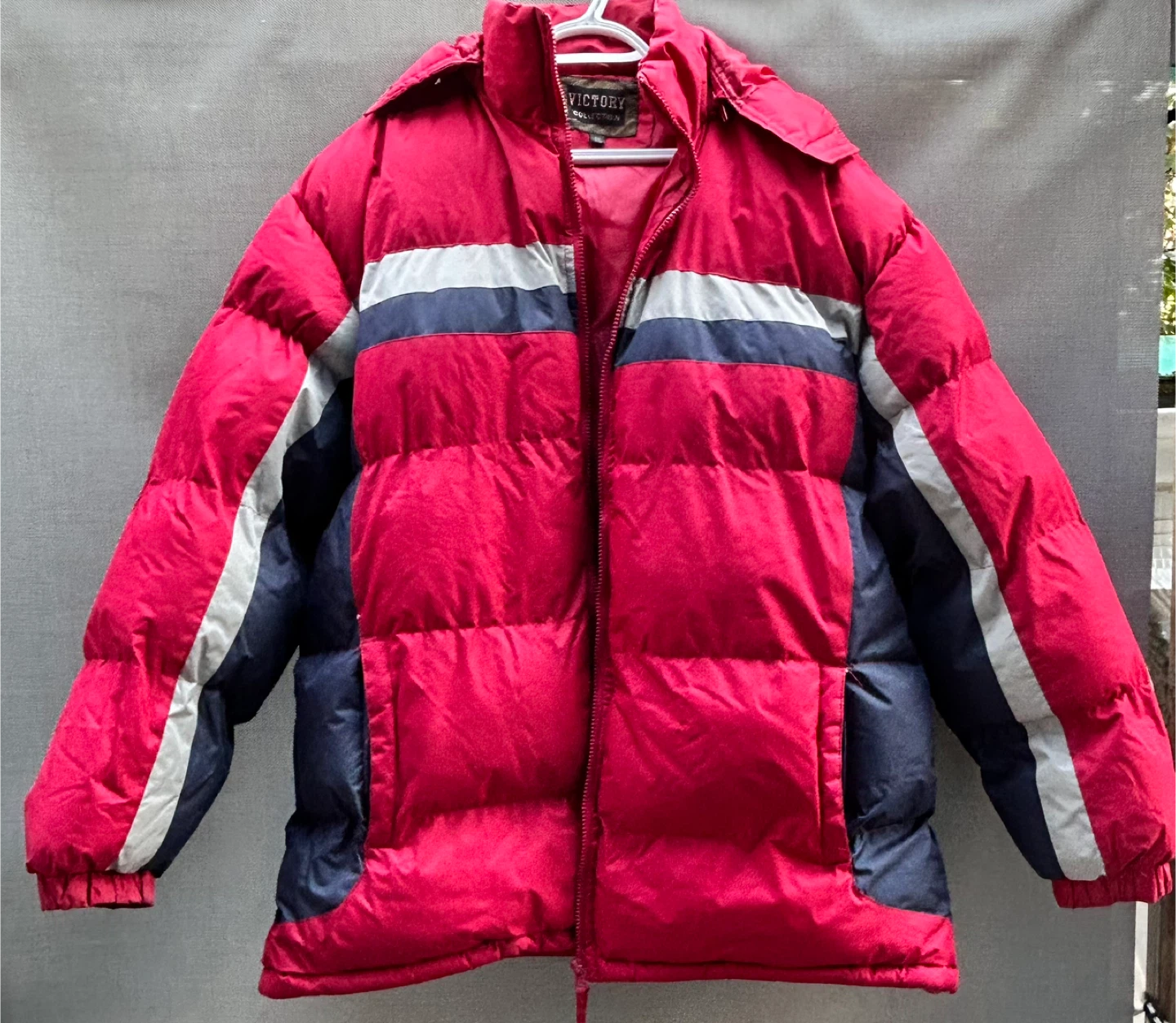 Selling a Victory Collection puffer jacket in fits size XL - XXL. It's a vibrant red with white and navy blue accents. Great for staying warm during the colder months!