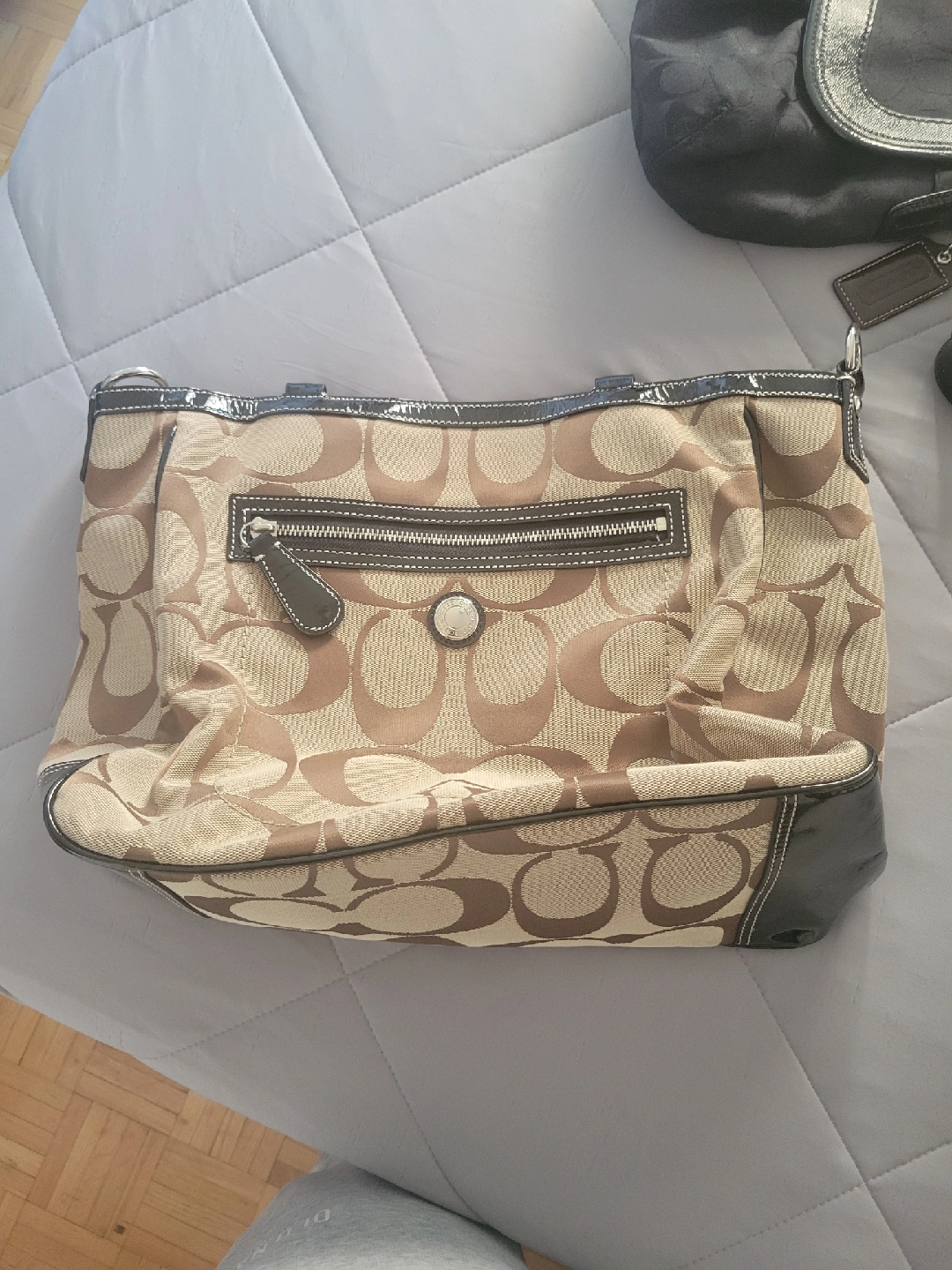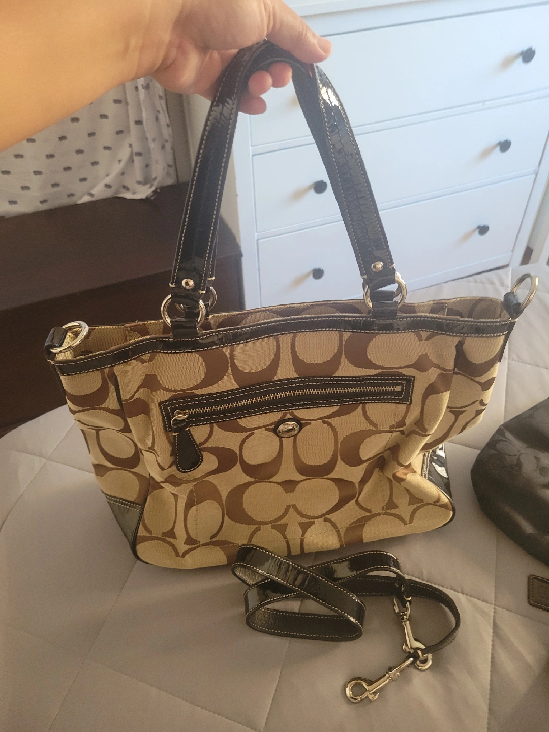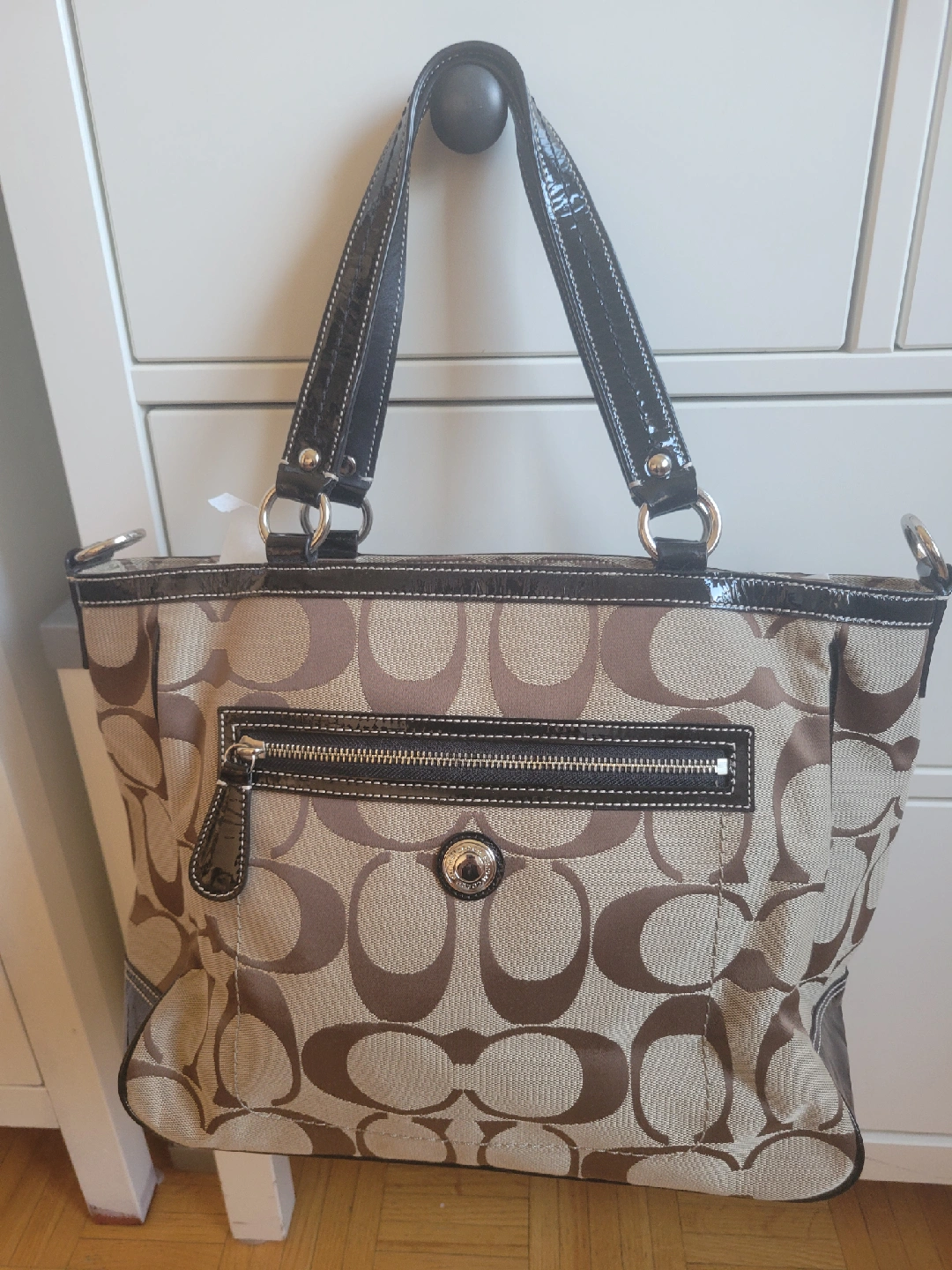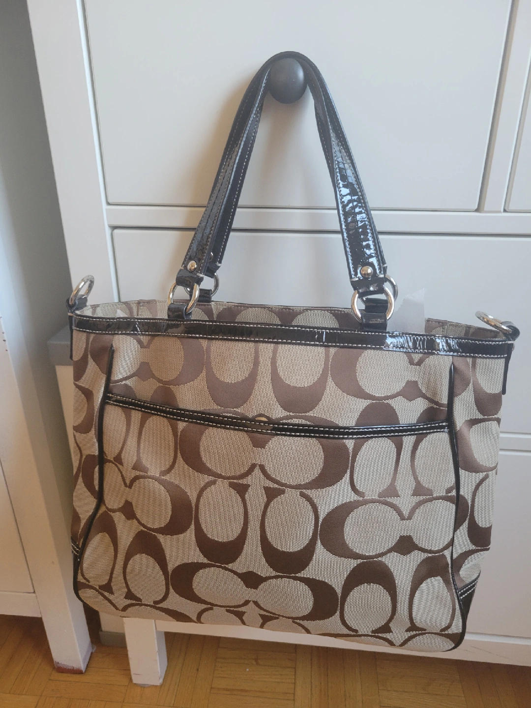 Selling a Coach tote bag with the signature "C" pattern in beige and brown. It has black patent leather trim and handles, along with a detachable strap. The bag features a zippered top closure and an exterior zippered pocket. Perfect for everyday use! cones with long strap, no rips or stain. barely used.