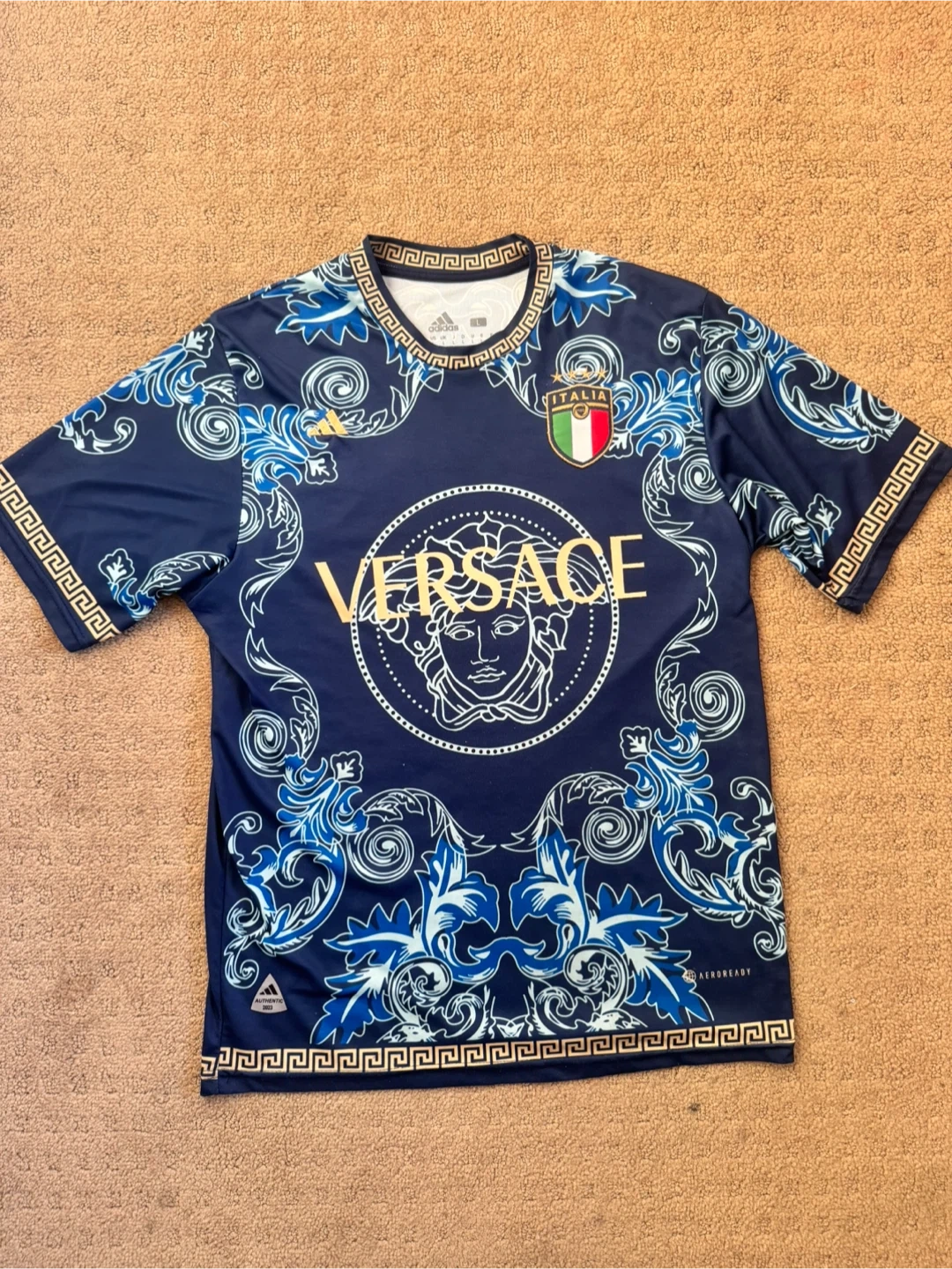 22Selling an Adidas x Versace Italy soccer jersey! The design is a cool navy blue with Versace-style accents and the Italian flag.