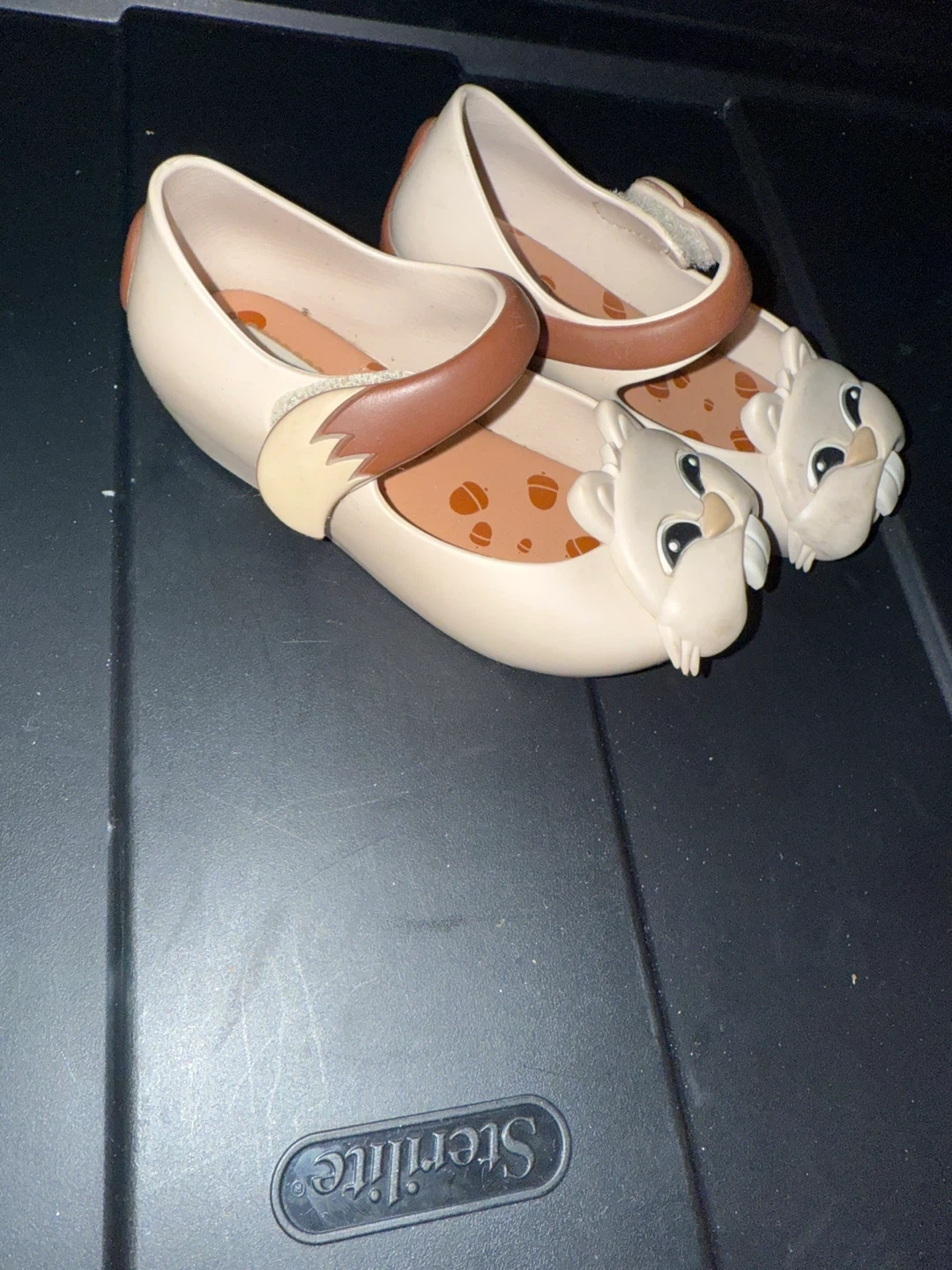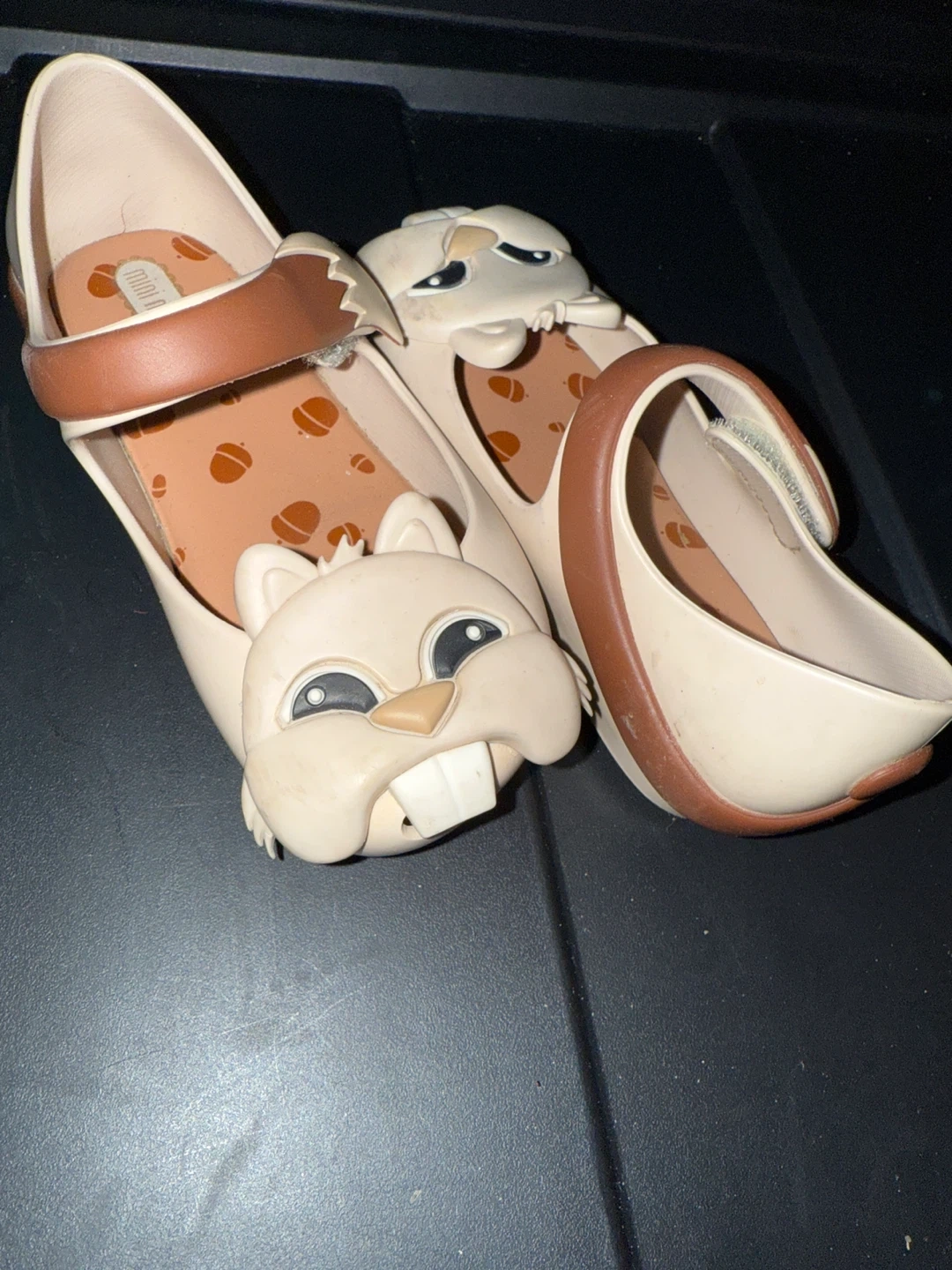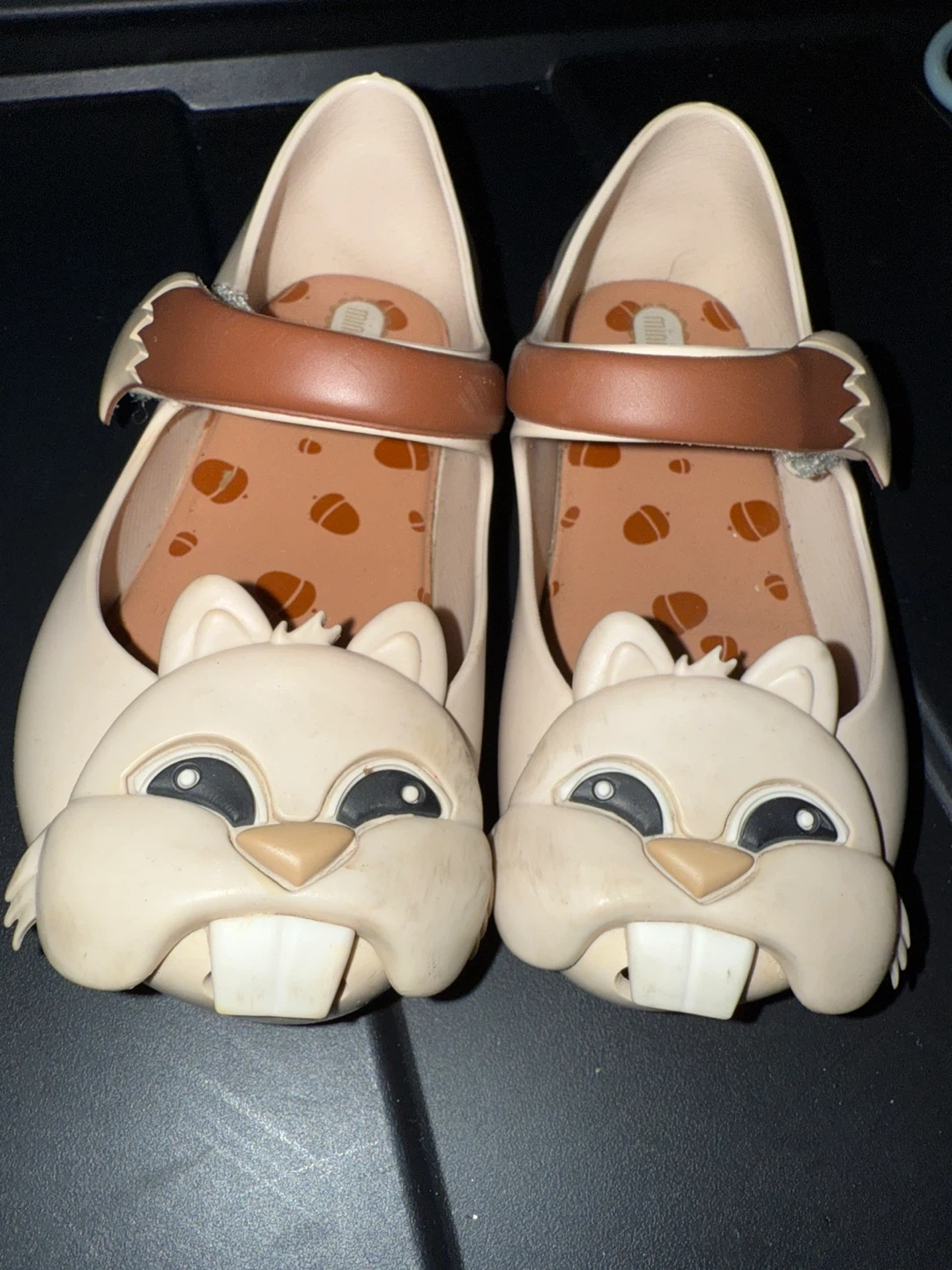 These adorable Mini Melissa shoes are perfect for your little one! They feature a cute squirrel design in cream and brown. They're pre-loved but still have lots of life left in them!
