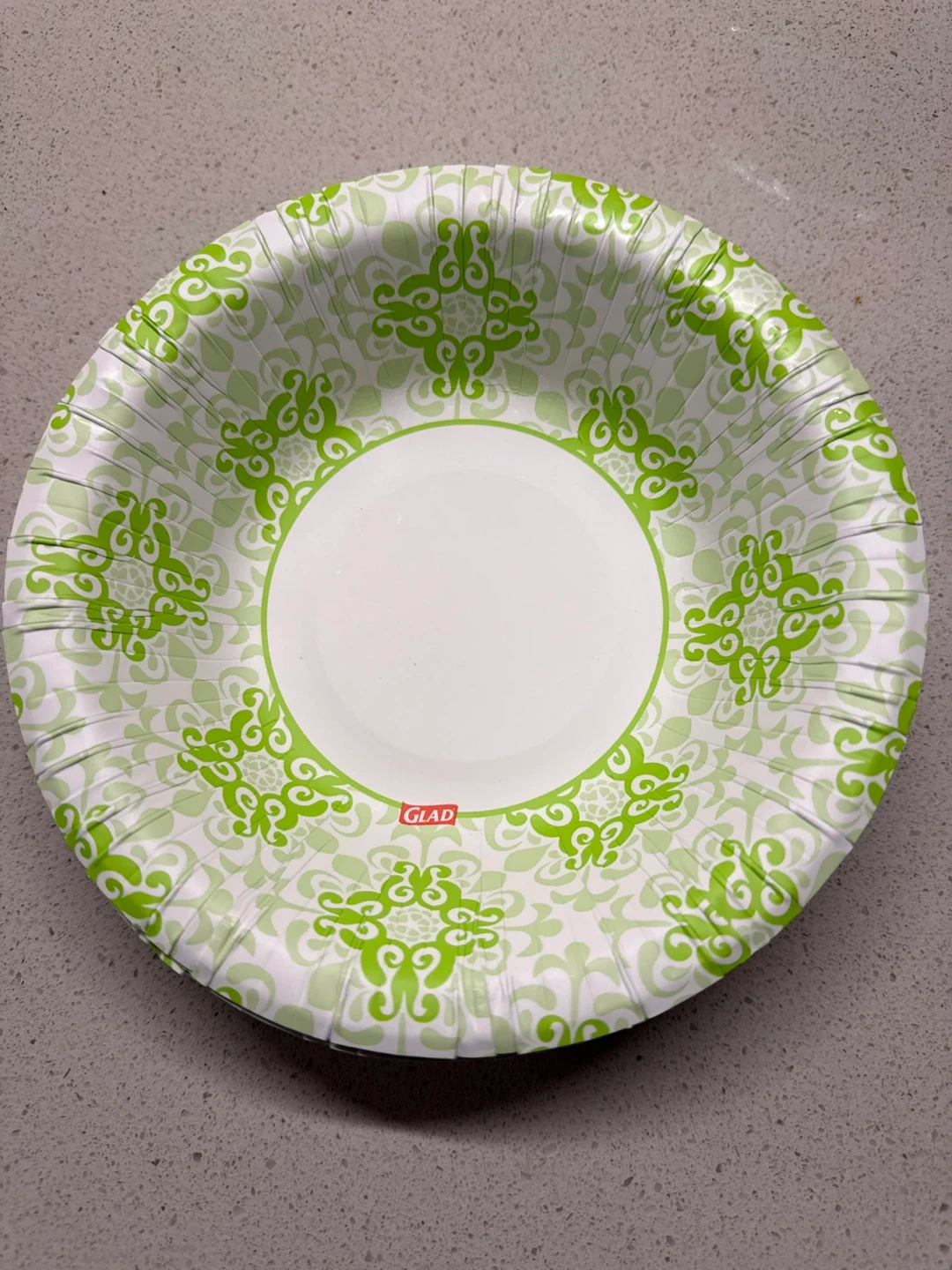 Selling a stack of Glad paper plates with a green pattern! These are perfect for picnics, parties, or just everyday use. They're lightweight and convenient for easy cleanup CASH ONLY