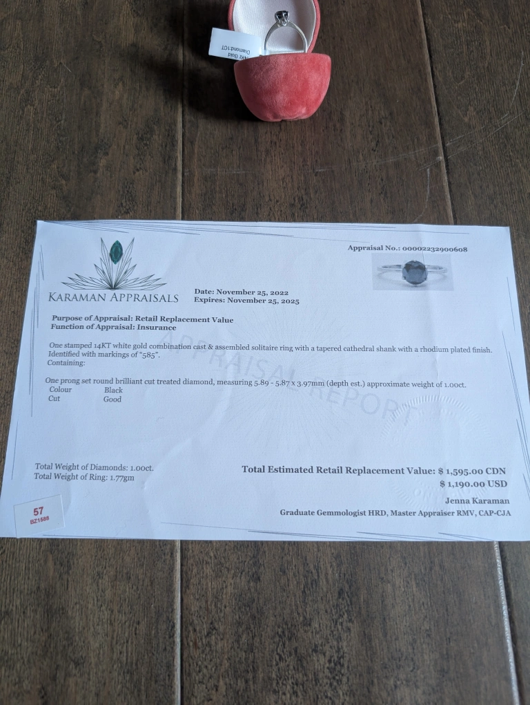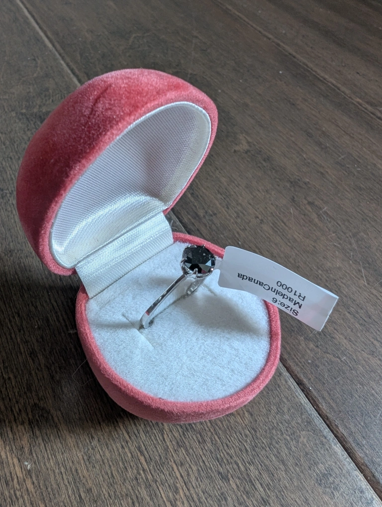 Brand new 14kt white gold black diamond ring for sale. One prong set brilliant natural genuine treated diamond, 1.00 carats. Ring size 6, made in Canada. Retail value $1595, selling for $650 FIRM. Comes with appraisal.