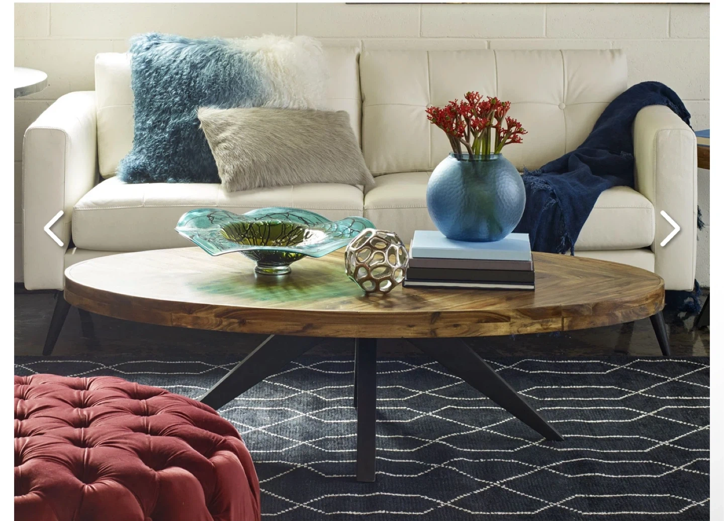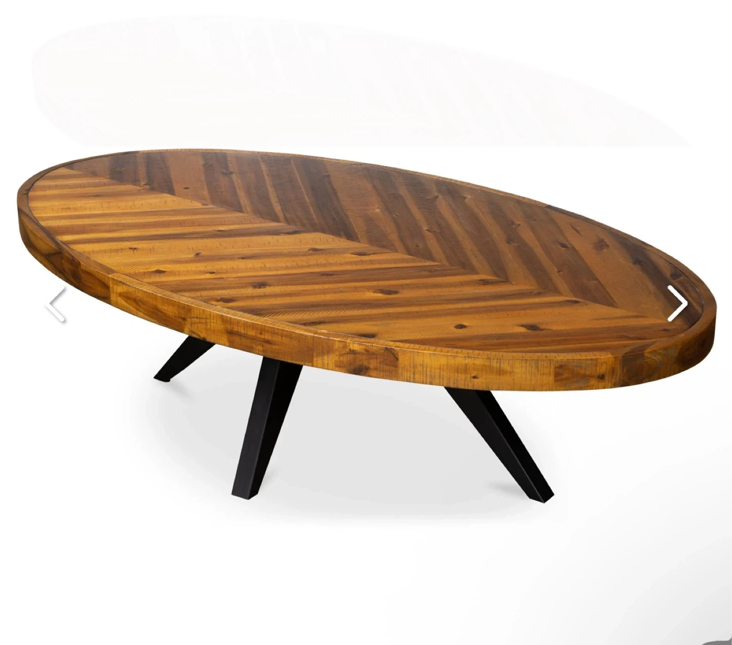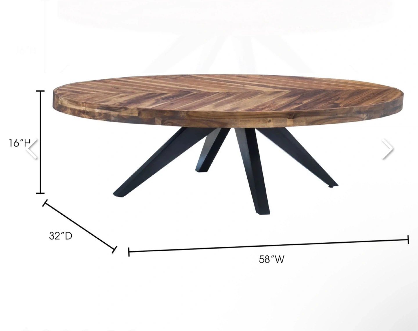 Selling a stylish oval coffee table from Moe's Home Collection! It features a beautiful wood top with a unique chevron pattern and sleek black metal legs. The table measures 58"W x 32"D x 16"H, making it a great size for most living rooms