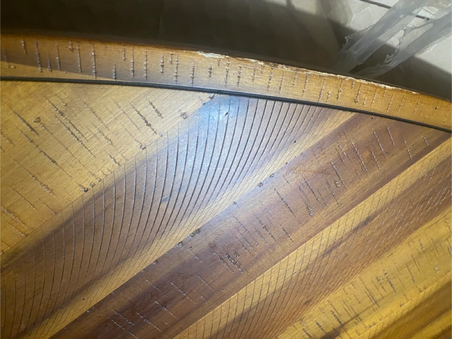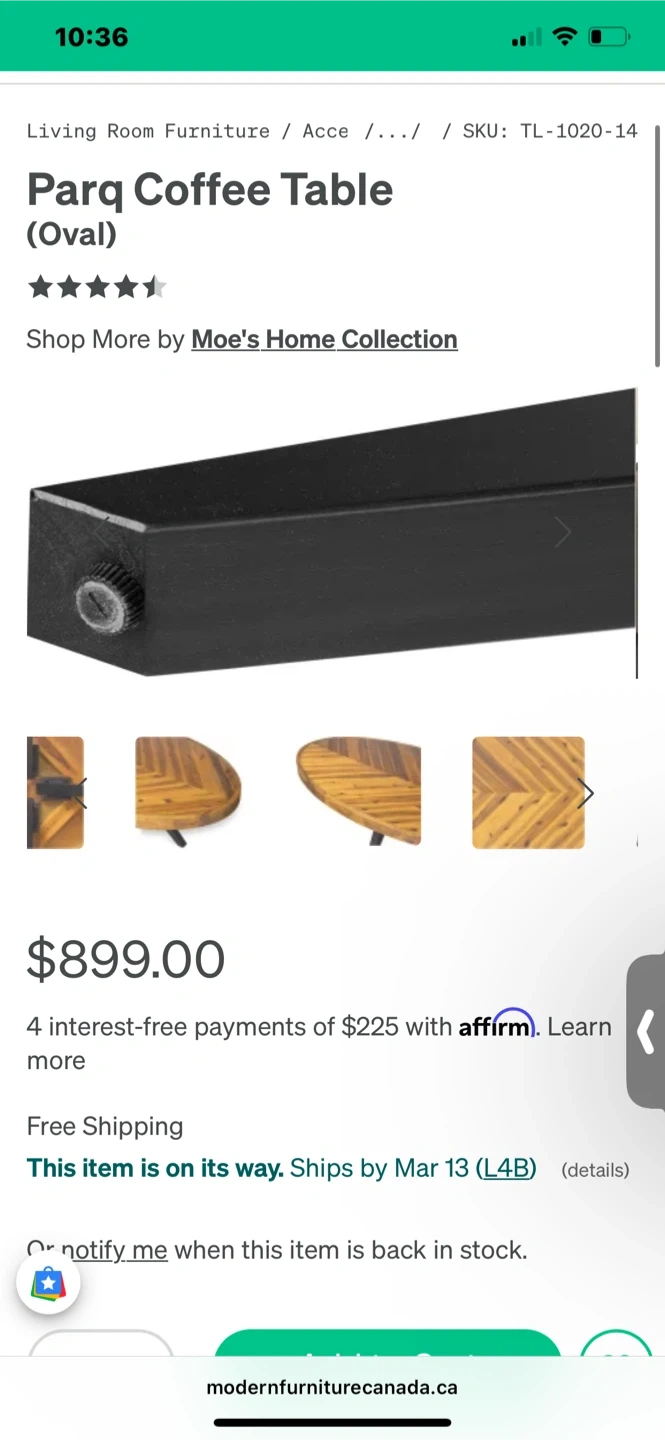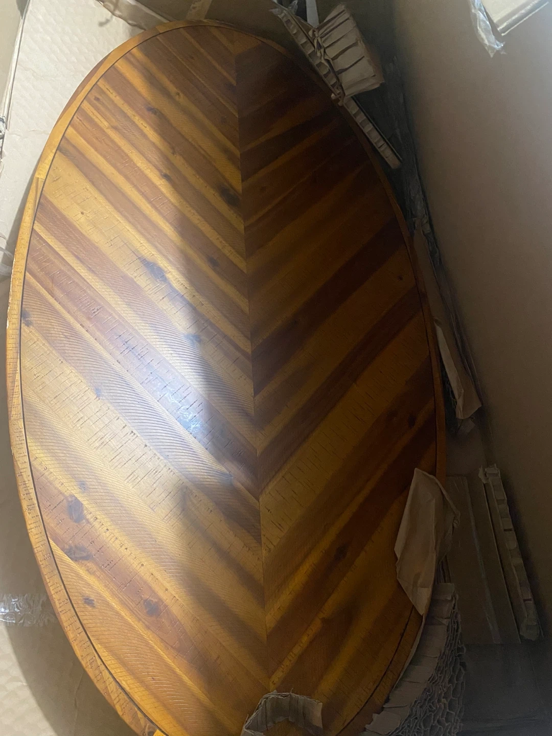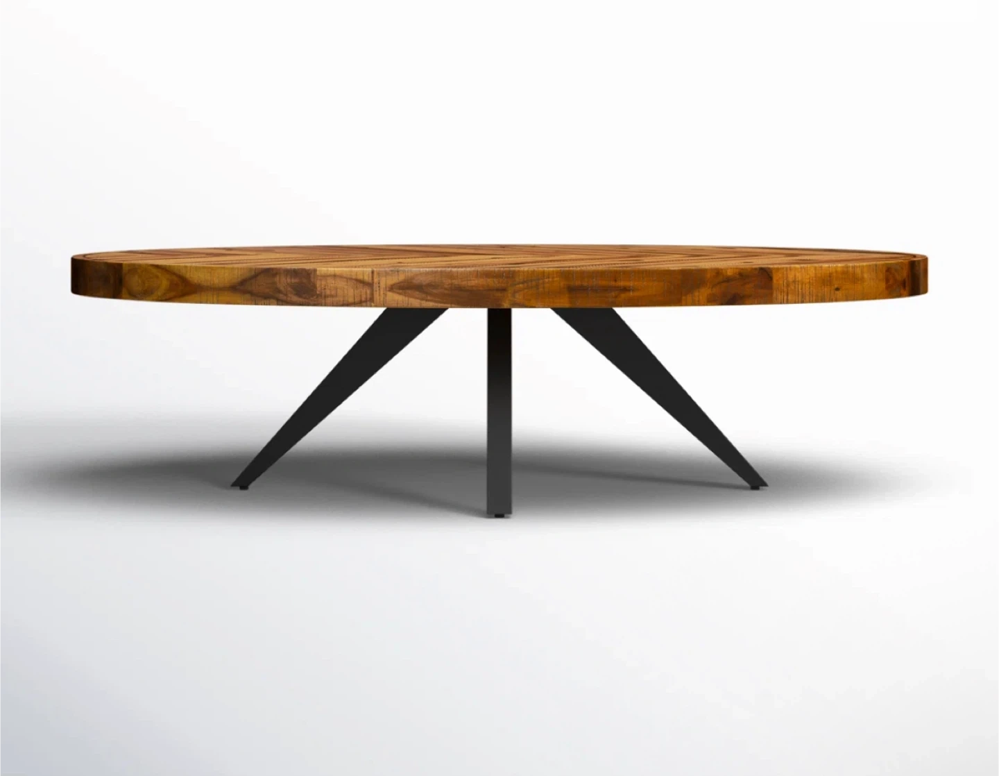 Selling a stylish oval coffee table from Moe's Home Collection! It features a beautiful wood top with a unique chevron pattern and sleek black metal legs. The table measures 58"W x 32"D x 16"H, making it a great size for most living rooms