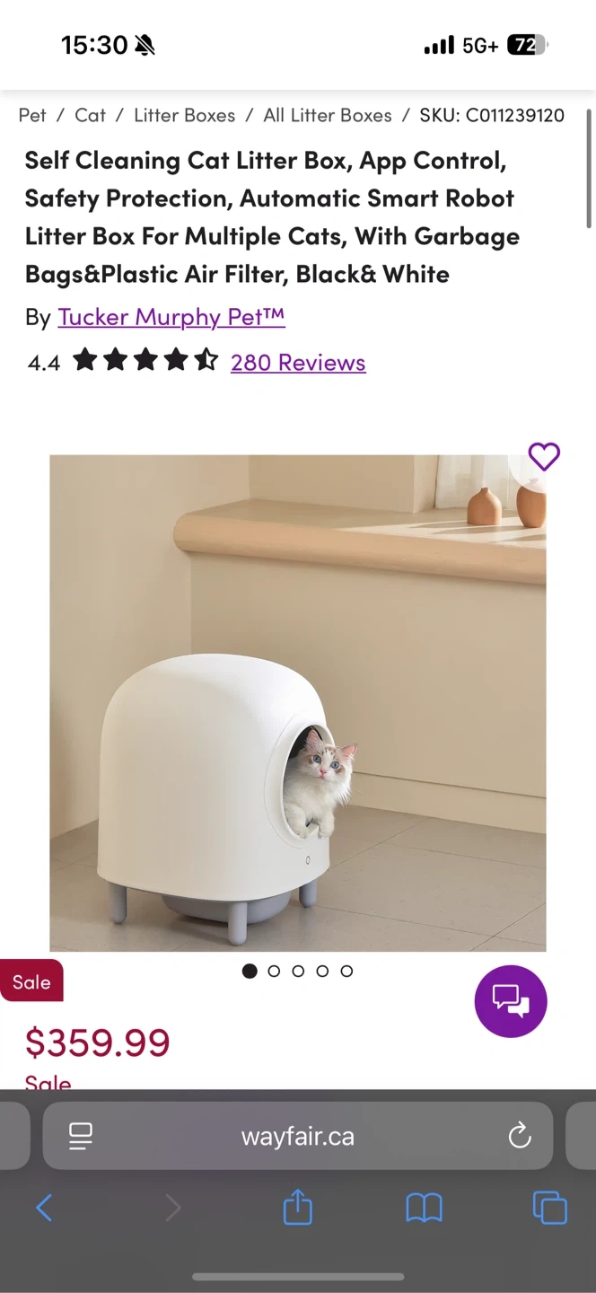 Best offer or trade or Selling a self-cleaning cat litter box by Tucker Murphy Pet. It features app control, safety protection, and is an automatic smart robot litter box designed for multiple cats. It comes with garbage bags and a plastic air filter, in black and white. Retails for $359.99.