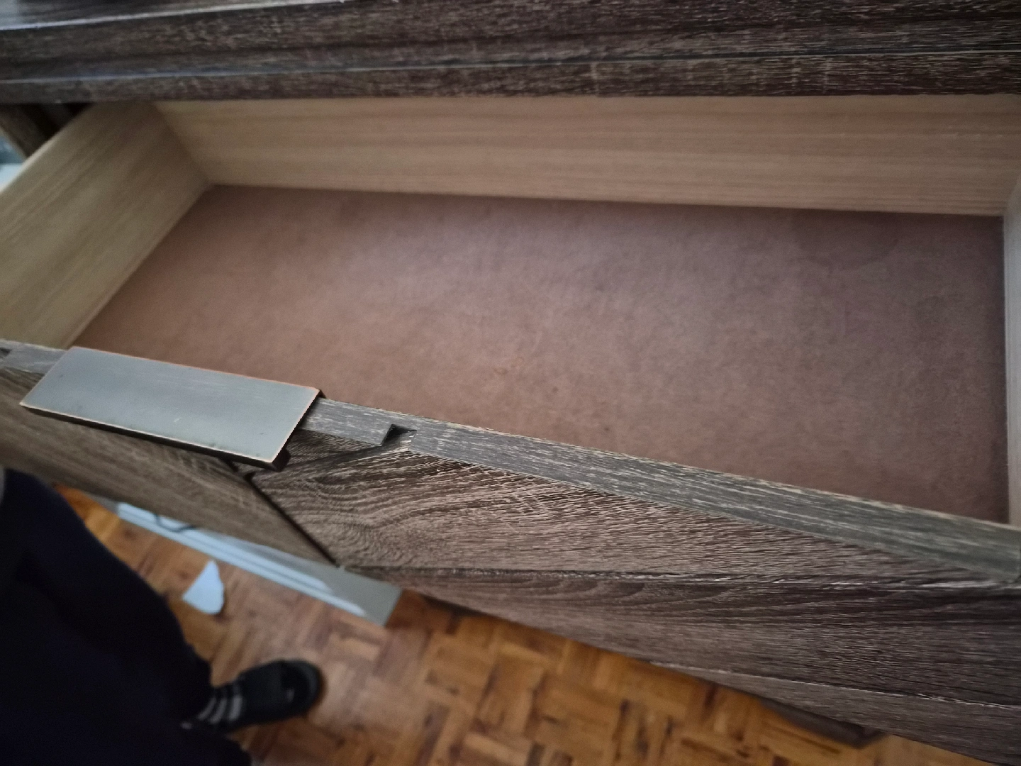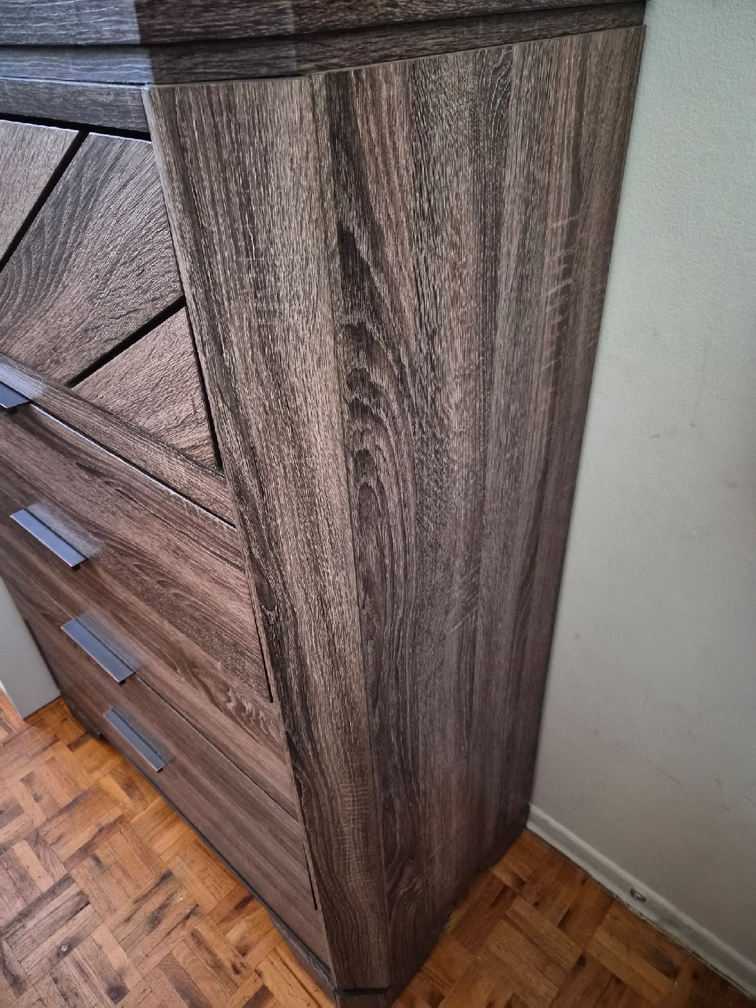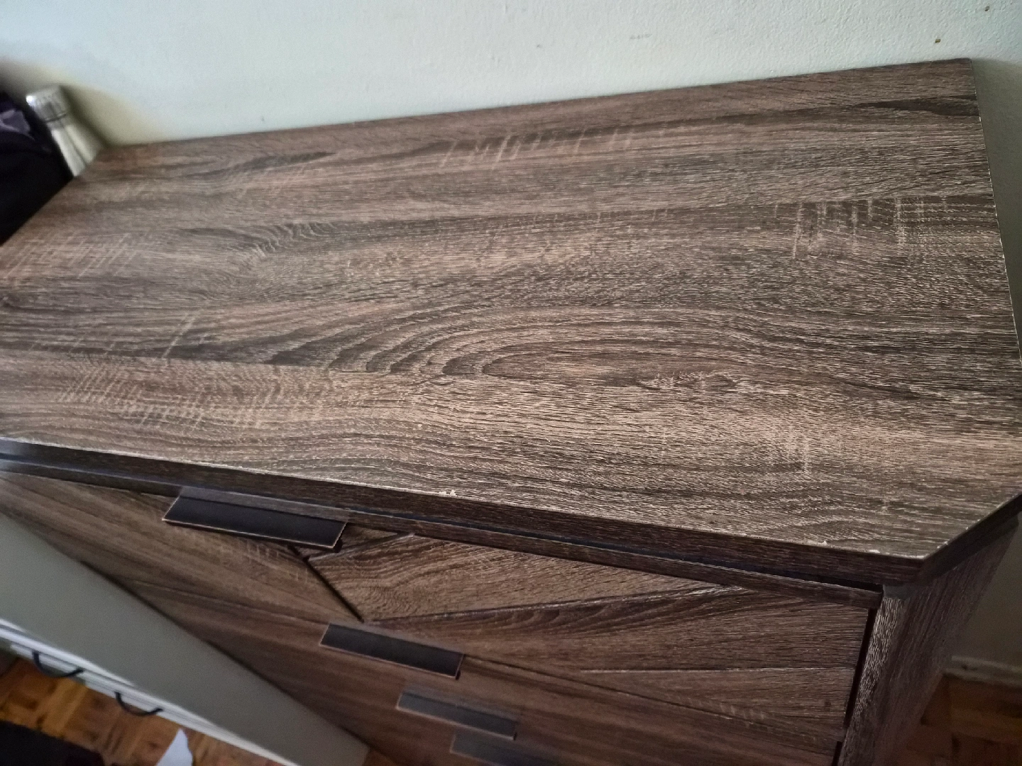 This is a lovely 5-drawer dresser with a wood grain finish. It has a modern design with sleek, simple handles. The drawers offer ample storage space for your clothes and other items. It's in great condition and ready for a new home! 16 x 35 x 47