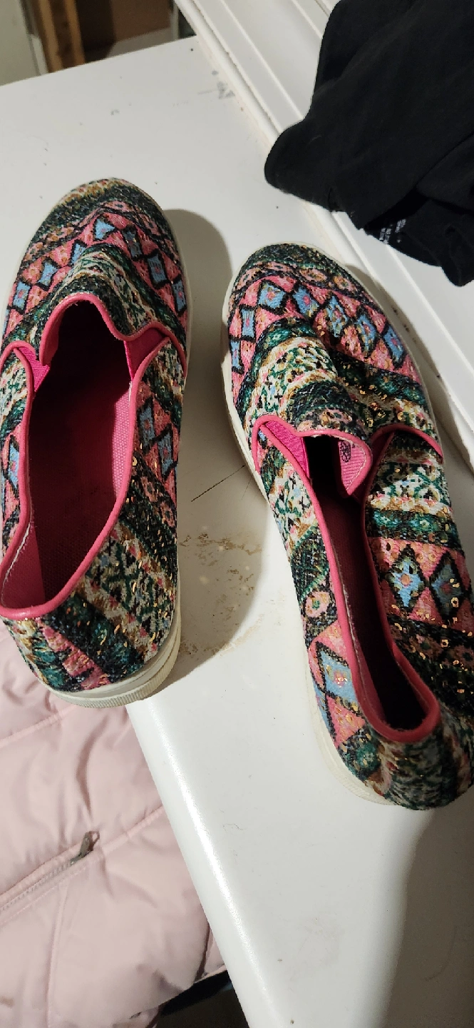Cute slip-on sneakers with a colourful pattern and pink trim! They are in good condition and ready for a new home. Size 8.5