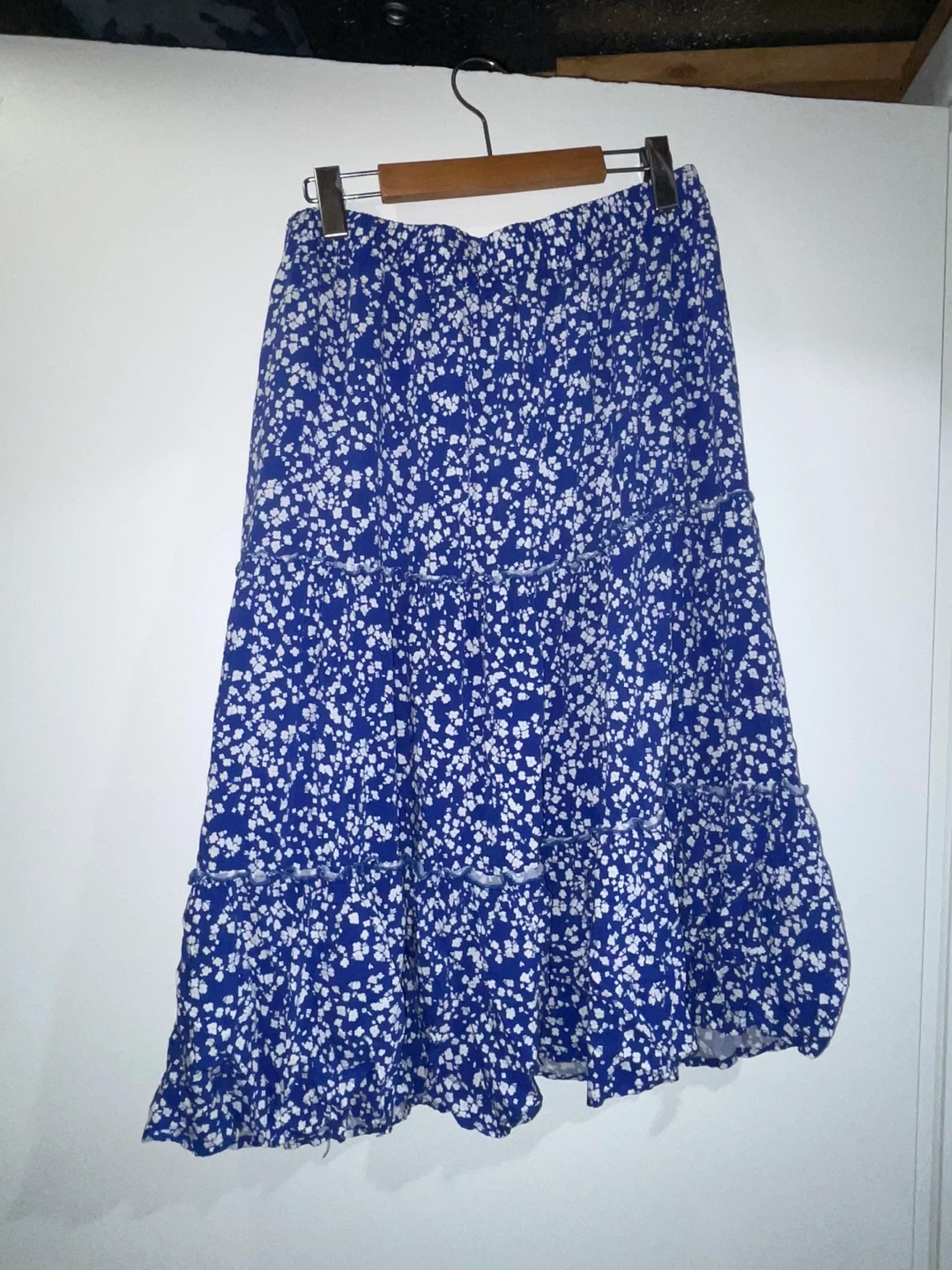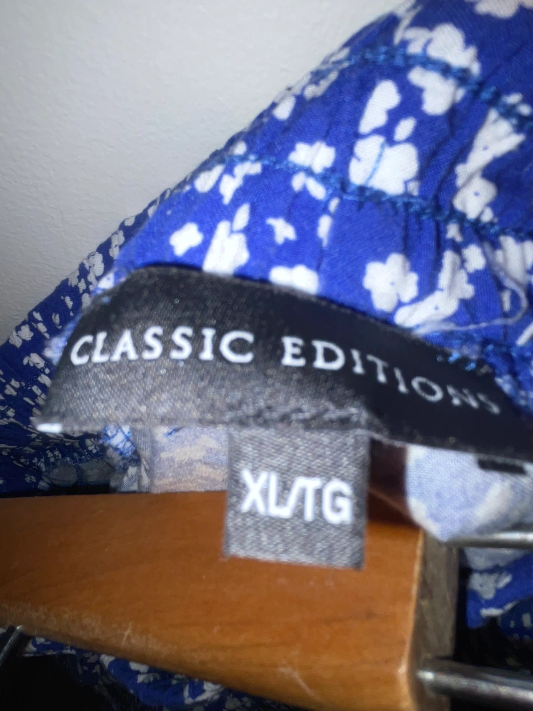 Here's a cute Classic Editions skirt in size XL! It has a blue background with a white floral pattern. Perfect for spring or summer.