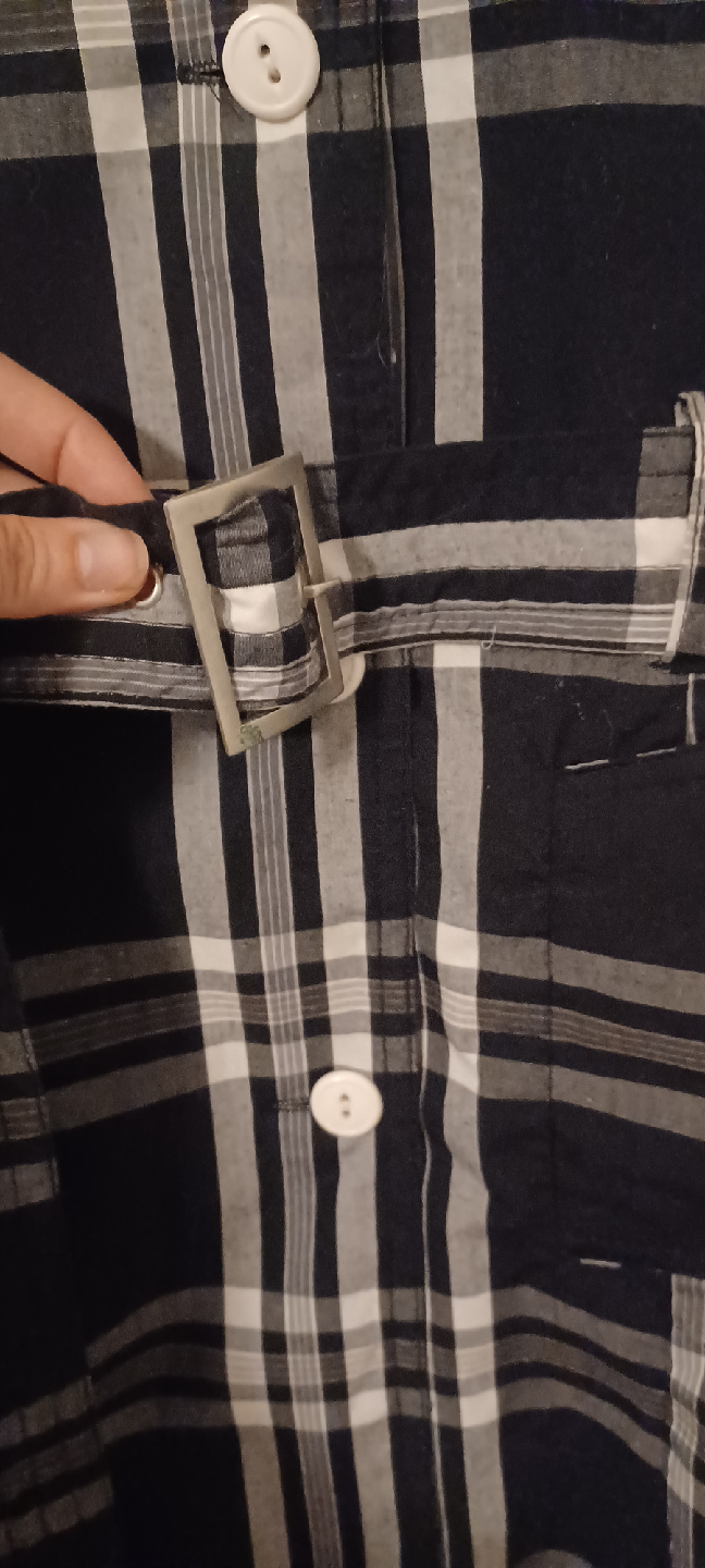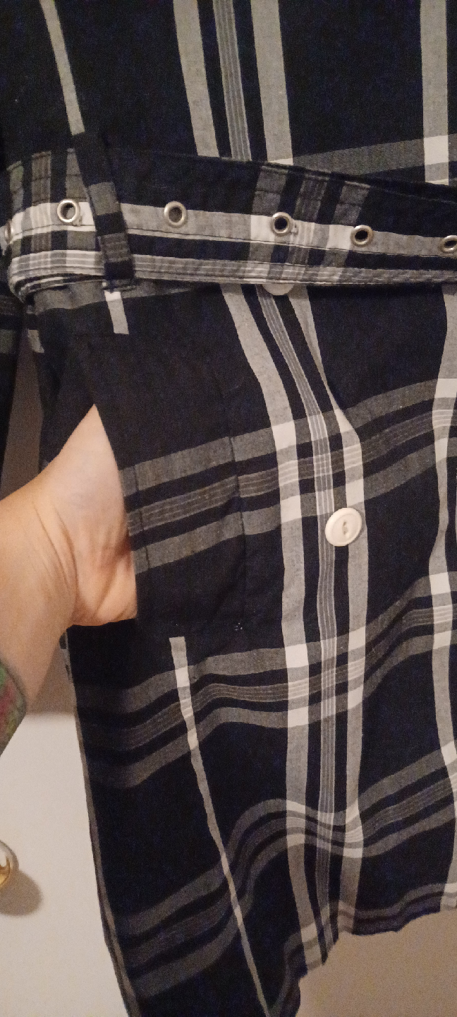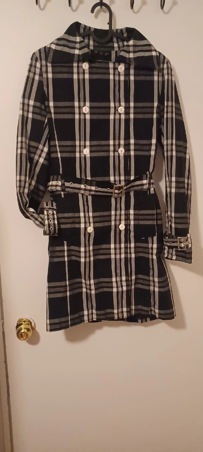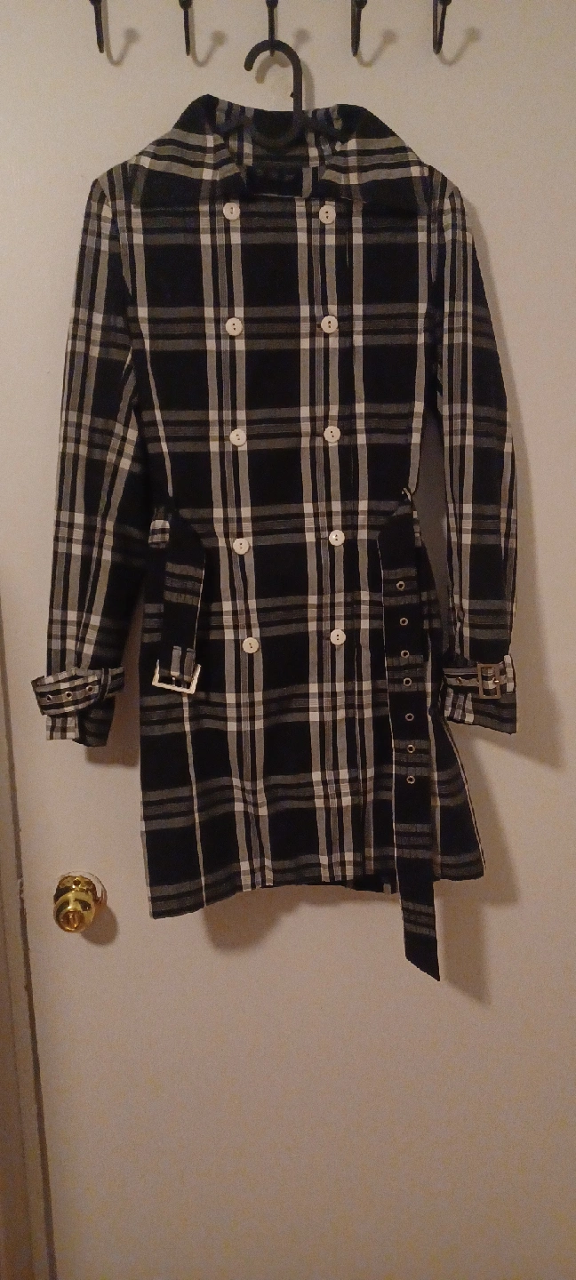 Here's a trench coat with a classic plaid pattern! It features a belted waist and double-breasted button closure. Perfect for adding a stylish layer to your outfit!