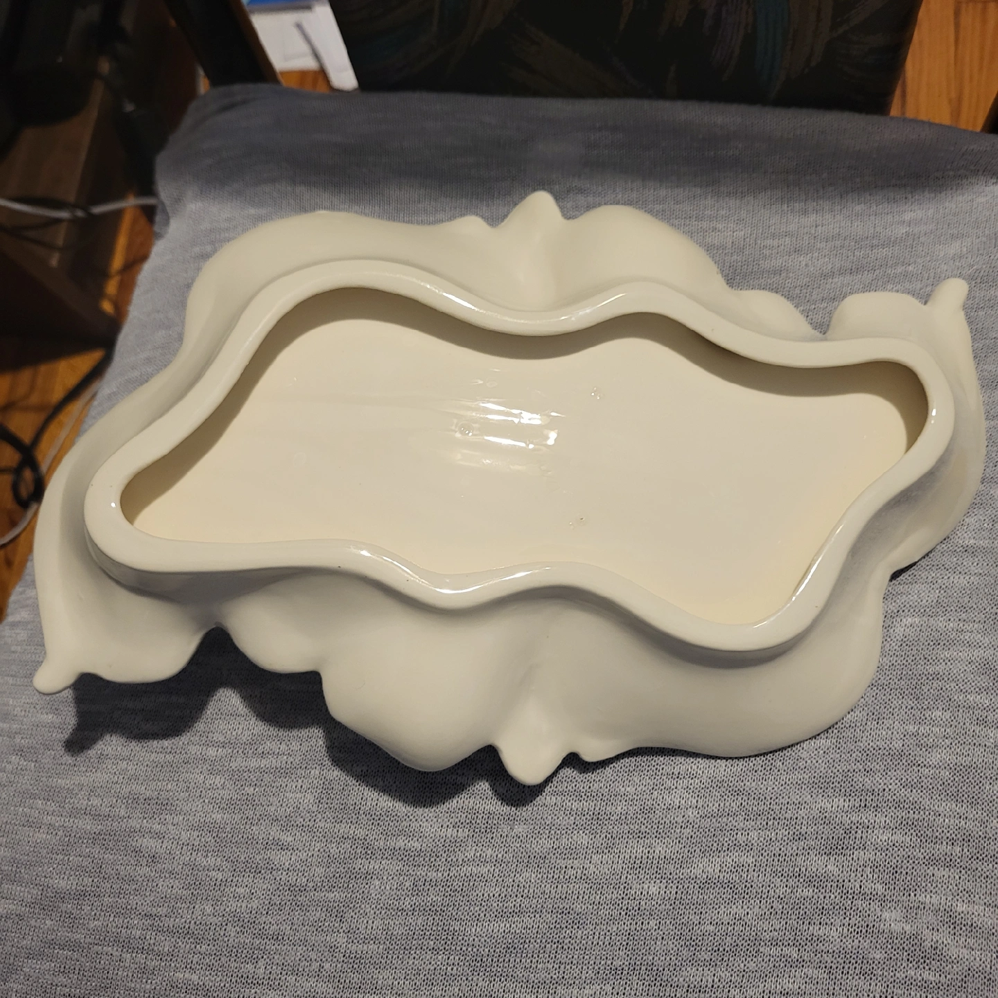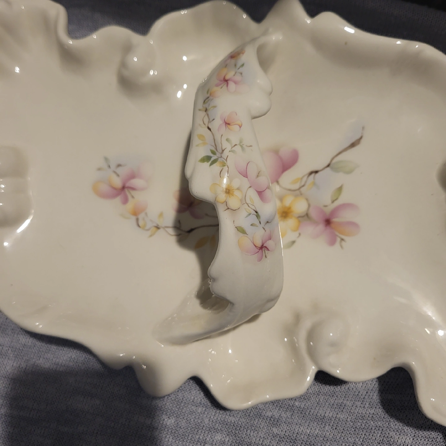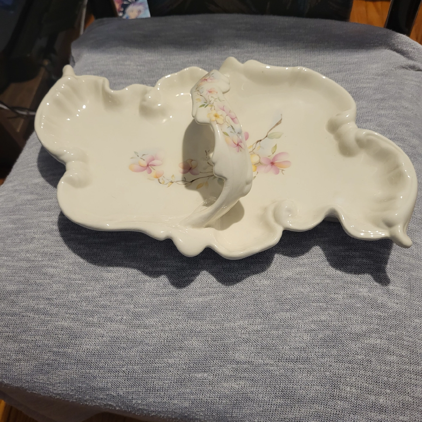 Selling a lovely serving dish with a floral handle. It's in great condition and perfect for serving snacks or appetizers. The handle adds a touch of elegance to any table setting 34 x 20 x 4 cm