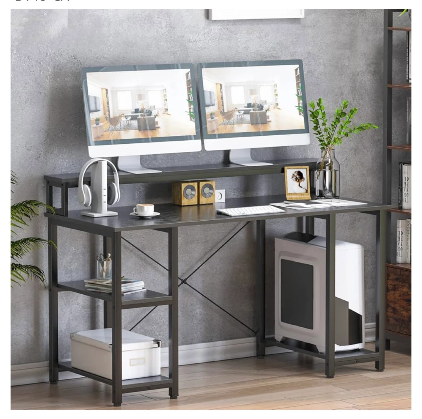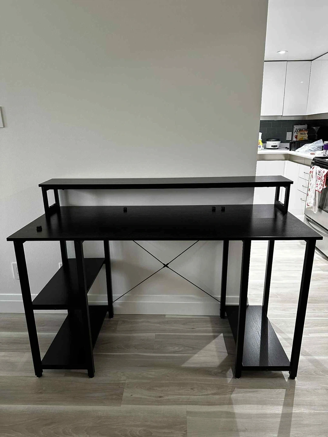 Used black work desk from Amazon, with a riser that provides additional space for your things or a monitor. Thereβs also cable holders stuck on. Slightly wobbly on one side.