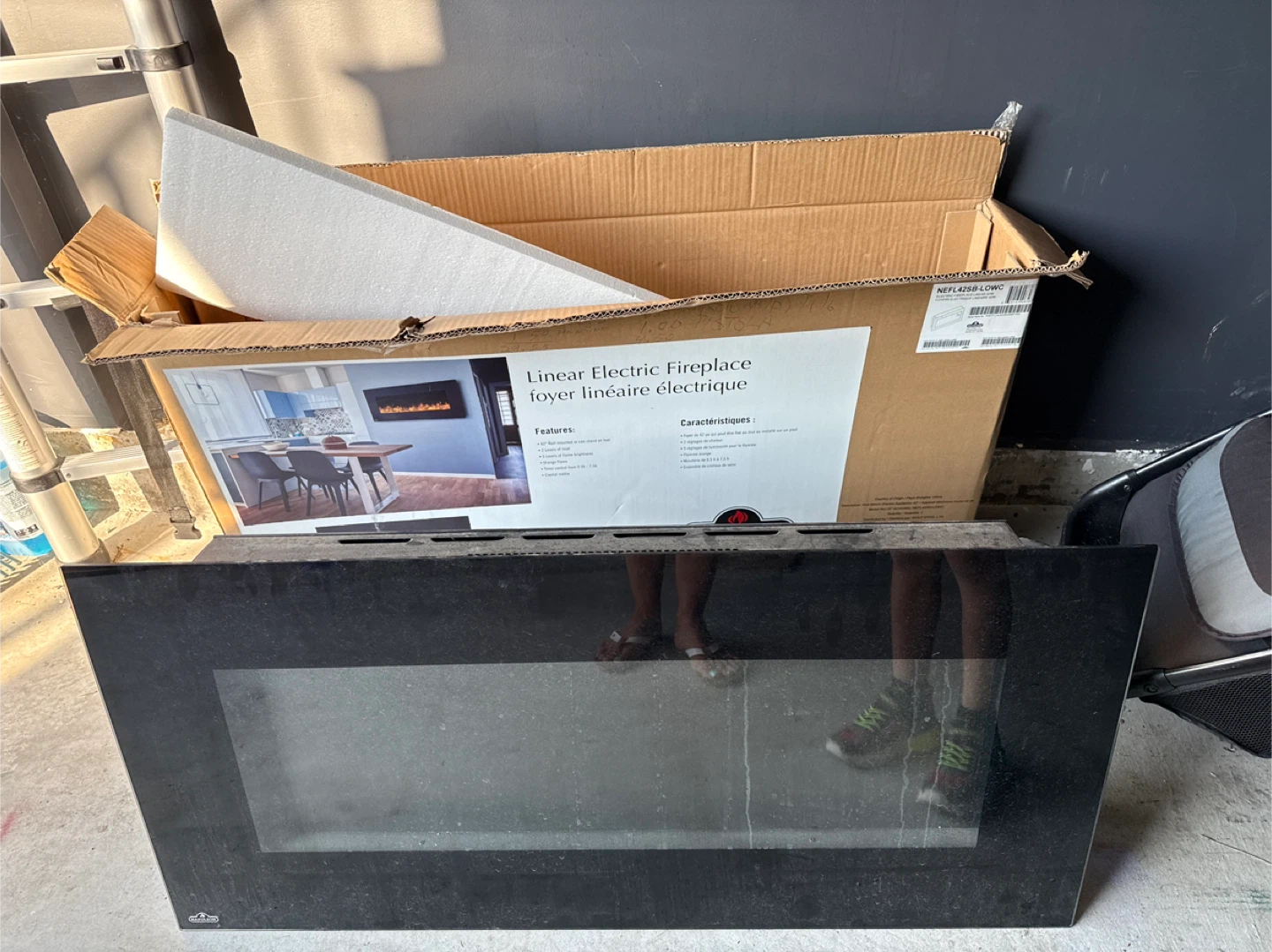 Napoleon linear electric fireplace. It comes with its original box. Plug was cut off to hardwire, you can likely replace that or just hardwire it. Pick up O’Connor and Parkview