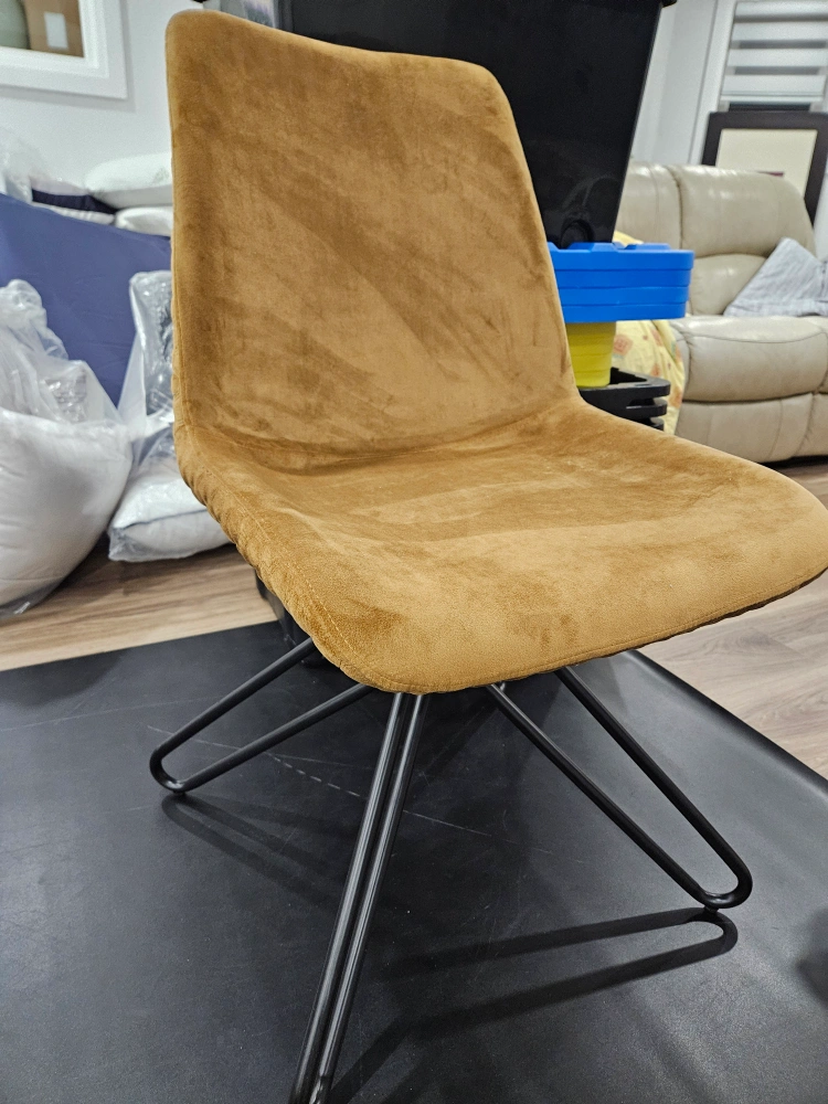 Selling a stylish swivel accent chair in a lovely mustard yellow colour! It has a unique quilted texture on the back and seat, and the black metal legs give it a modern look. The chair is made with all new material consisting of 100% polyurethane foam padding. It's a great addition to any room! I have 4 chairs 30$ each chair all three for 75$ but one chair need to fix the leg (free)