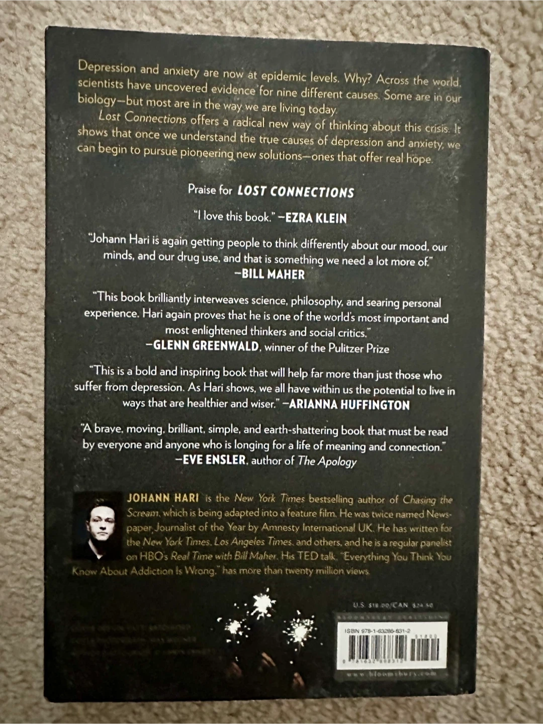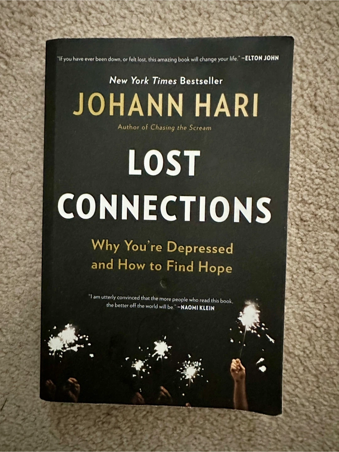 Selling the book Lost Connections by Johann Hari. It's a New York Times Bestseller that explores why you're depressed and how to find hope. A thought-provoking read!