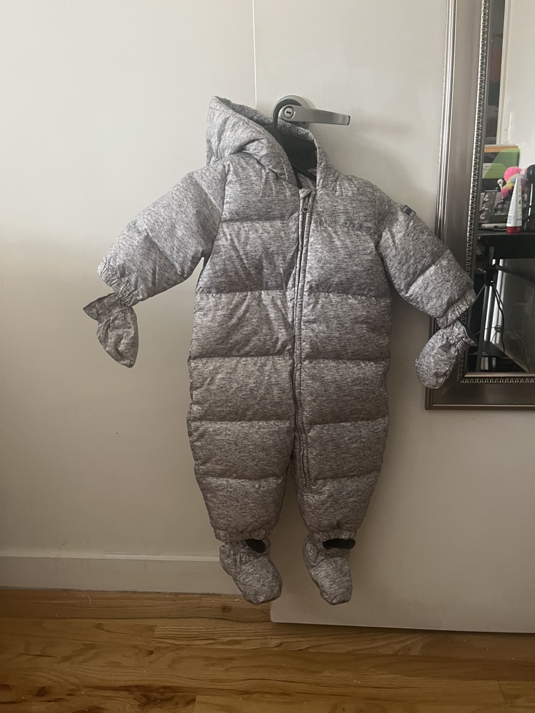 This is a baby padded snowsuit in good condition. It's perfect for keeping your little one warm during the winter months. It includes attached mittens and booties to keep baby snug from head to toe!