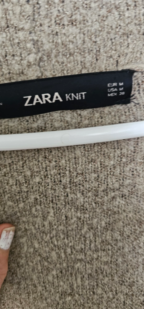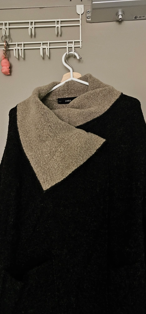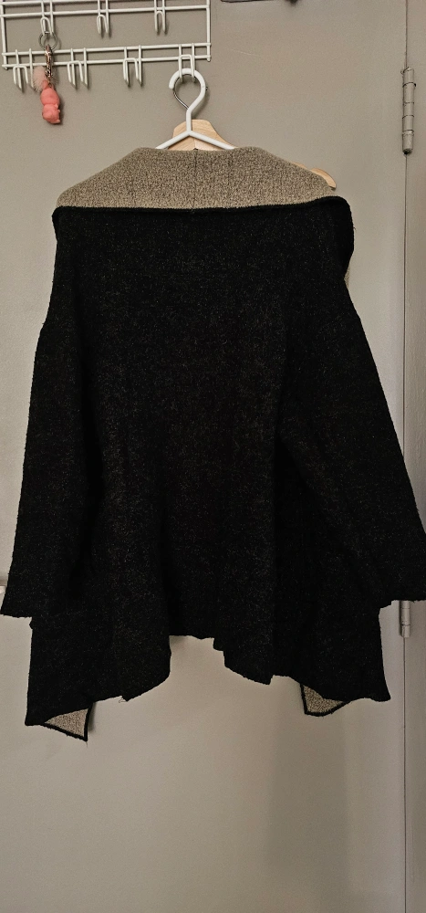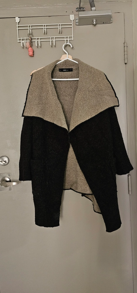 Cozy Zara Knit cardigan in size M! It's a stylish piece with a unique collar design and a comfortable fit. The cardigan features a black and beige colour scheme. Perfect for layering during cooler weather!