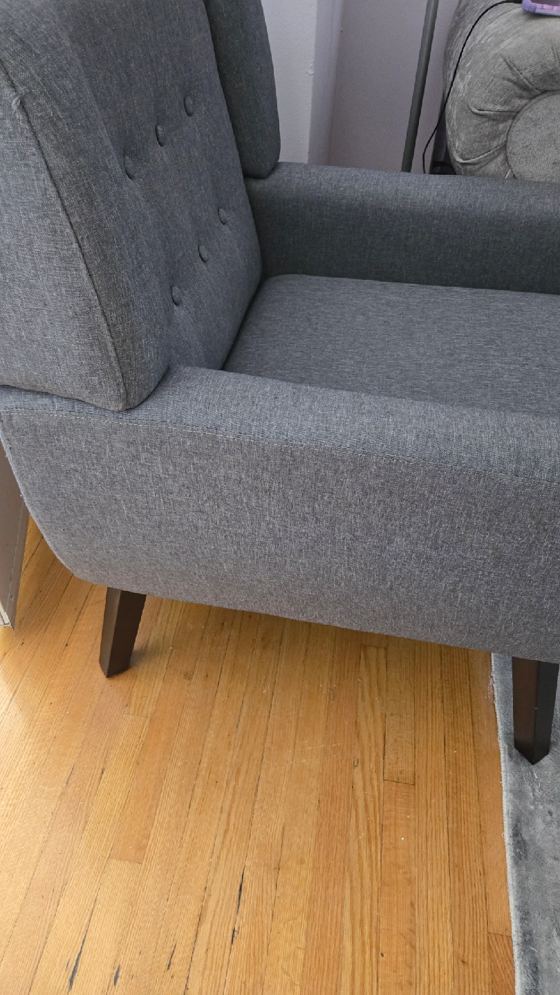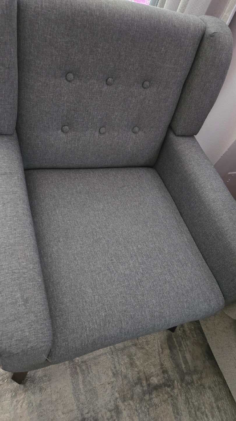 21Selling 2 comfy grey armchairs that's in great condition! 200 each o.b.o. It has a classic design with button detailing on the back. Perfect for adding a touch of style and comfort to any room. It's a great chair for relaxing with a book or watching TV selling as is...