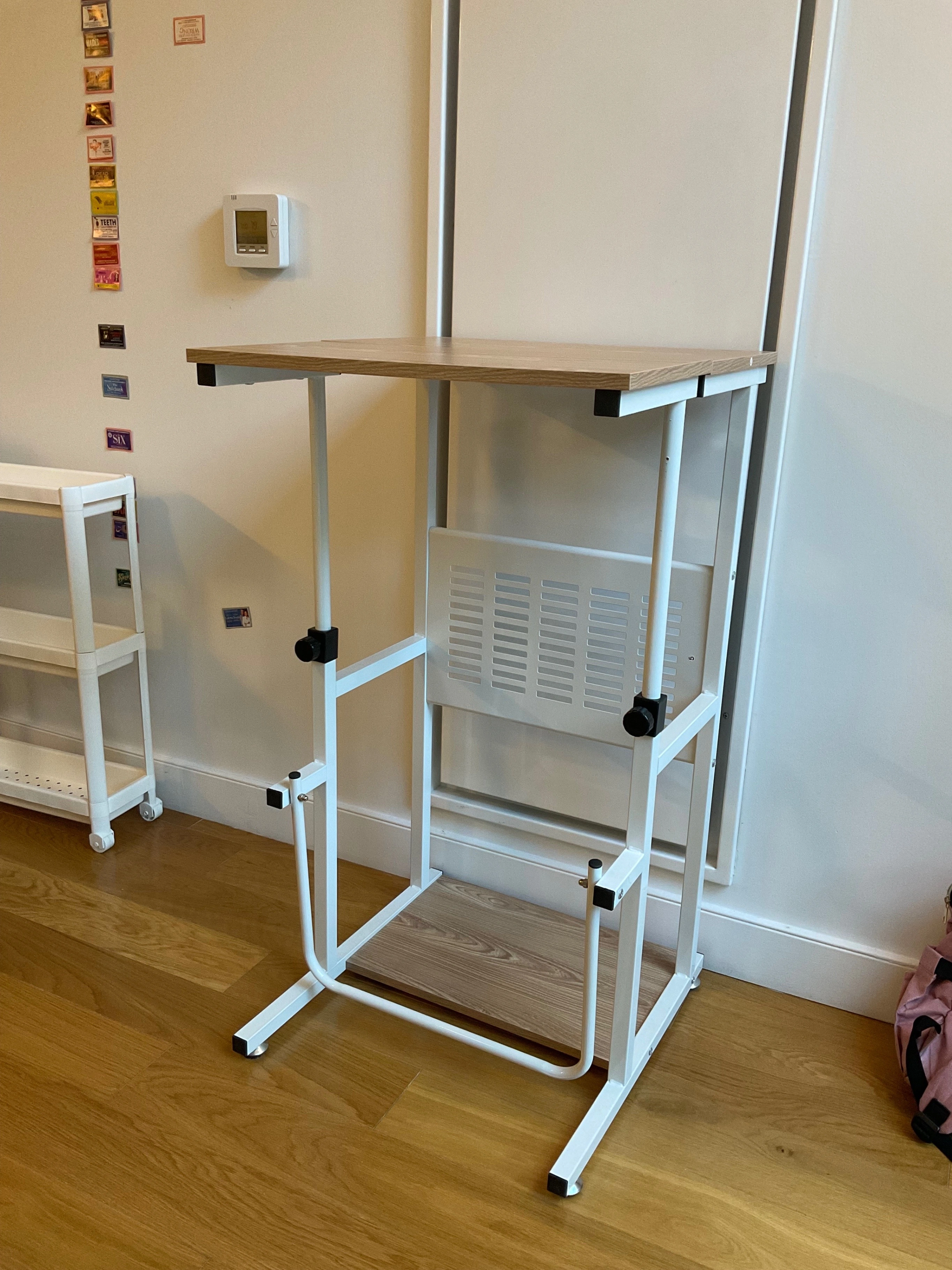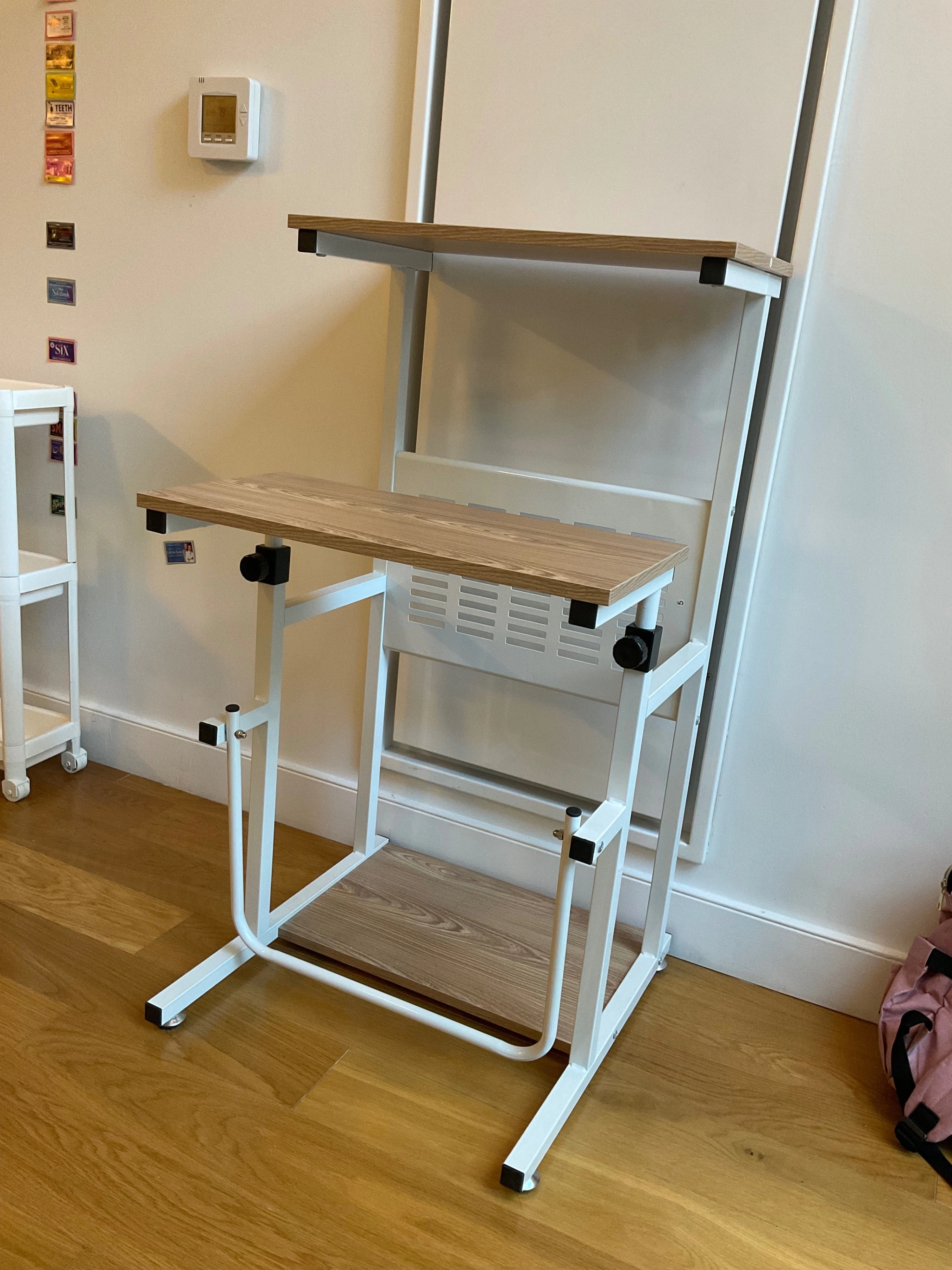 The desk can be adjusted to different heights using the knobs at the front, as a two tier or one tier standing desk. Perfect small-space desk solution. Excellent condition, used for less than a year.