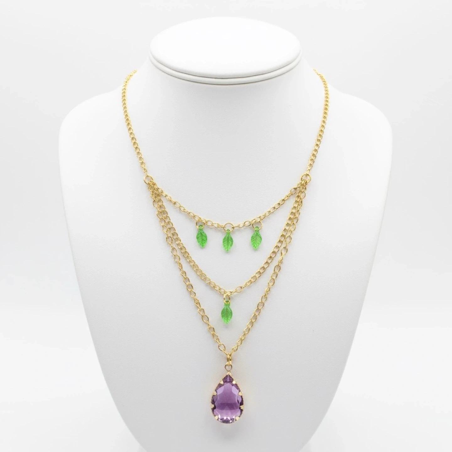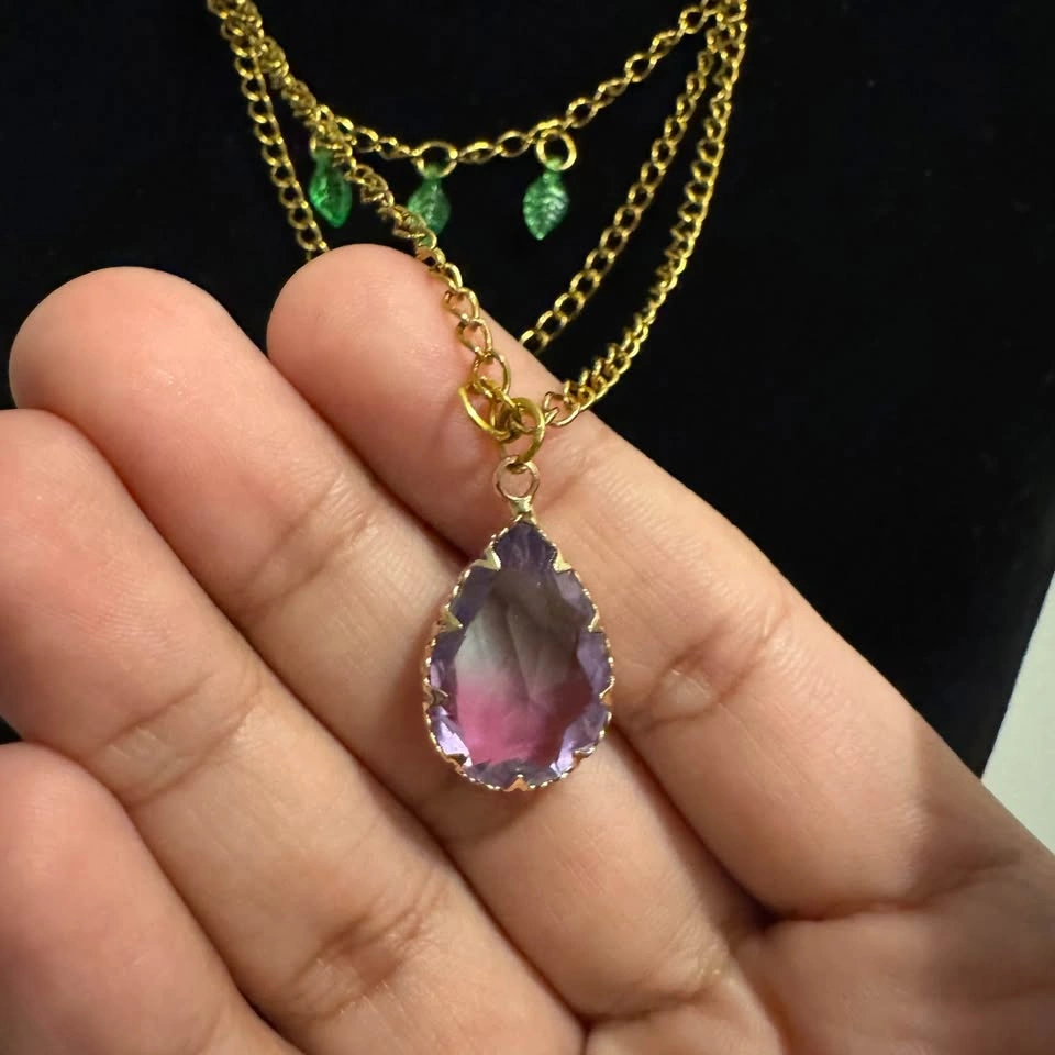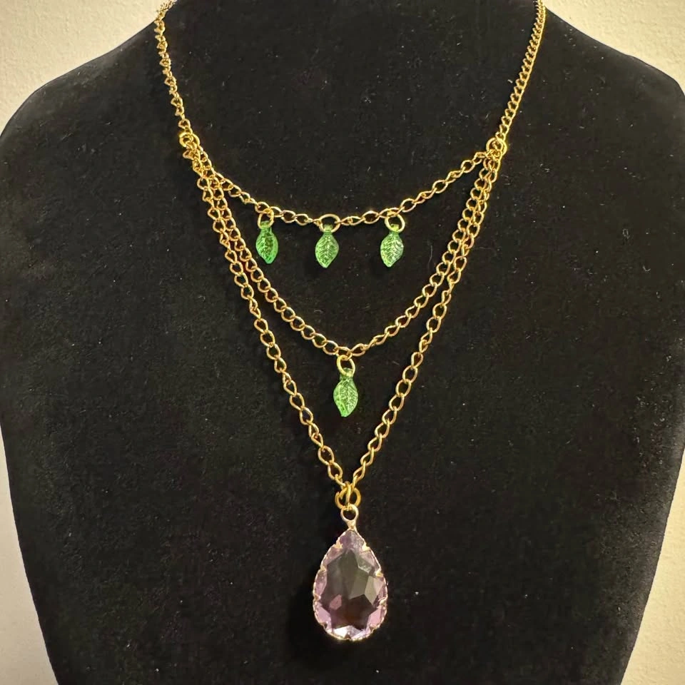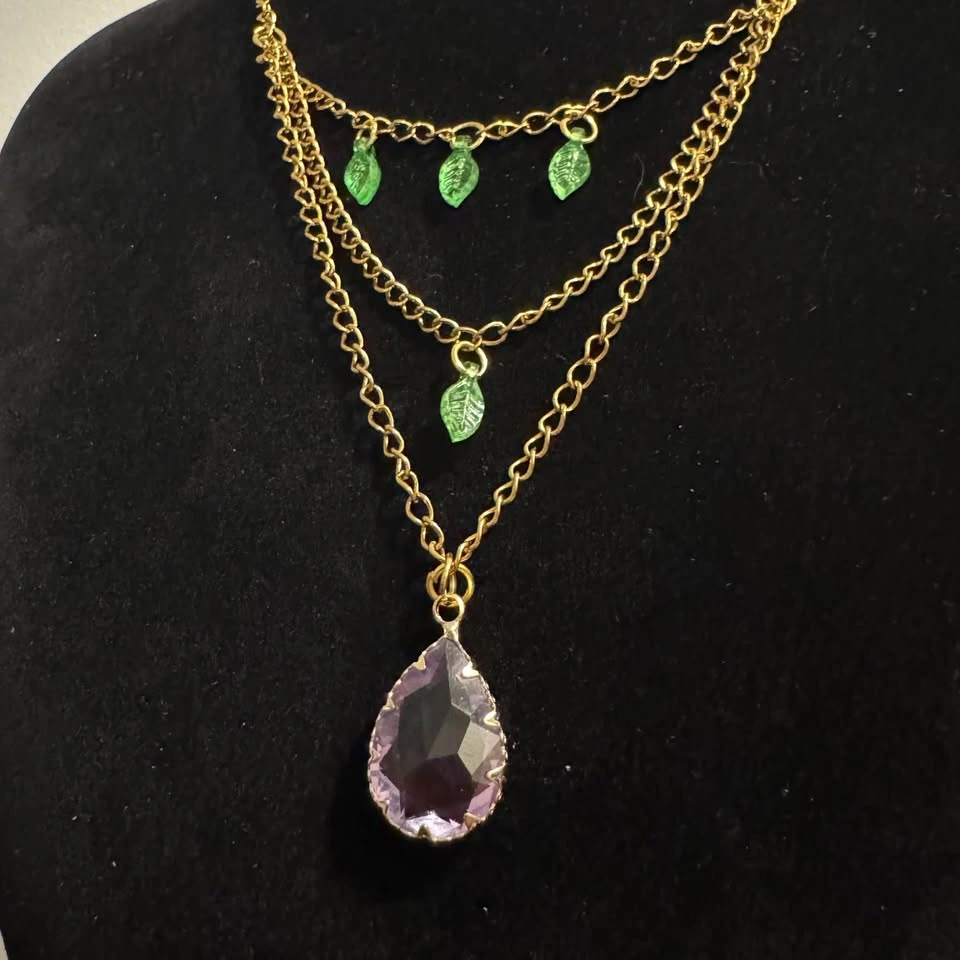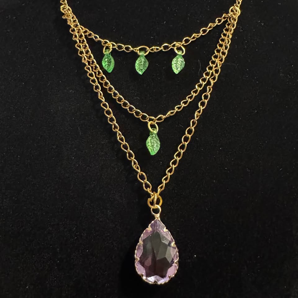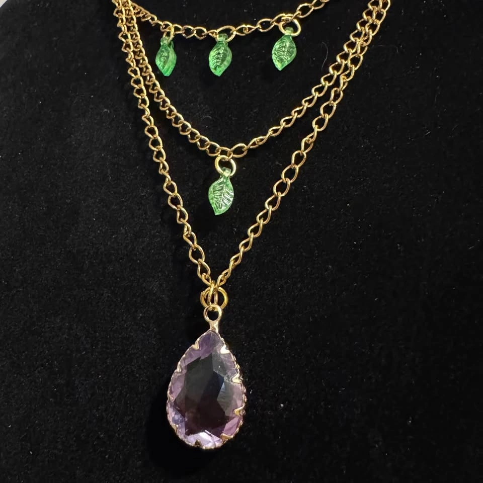 Stunning gold tone layered necklace features sweet green leaf acrylic pendants and a beautiful ombre purple pink glass crystal pendant. Beautiful fairycore vibes! π§πΌββοΈ Beautifully repurposed and handmade from broken/vintage jewelry. This necklace is adjustable.