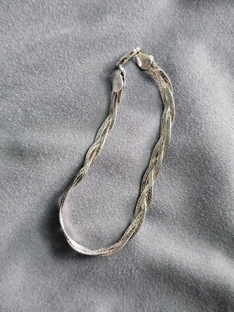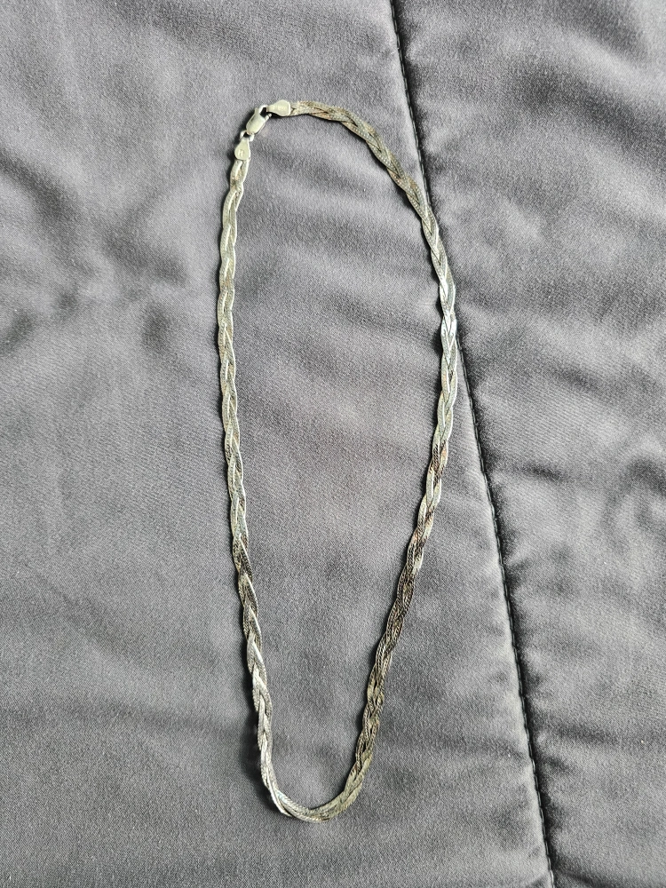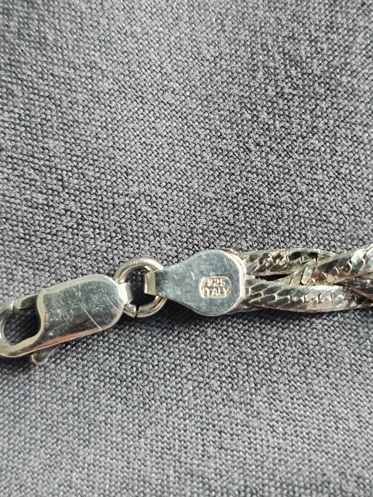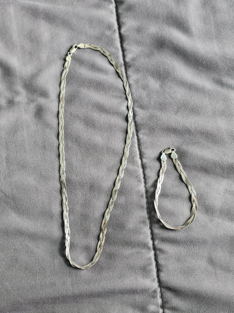 Selling a lovely braided sterling silver bracelet 8" and necklace 20"set. Both pieces have a delicate woven design and are stamped '925 Italy'. They'd make a beautiful addition to anyone's jewellery collection!