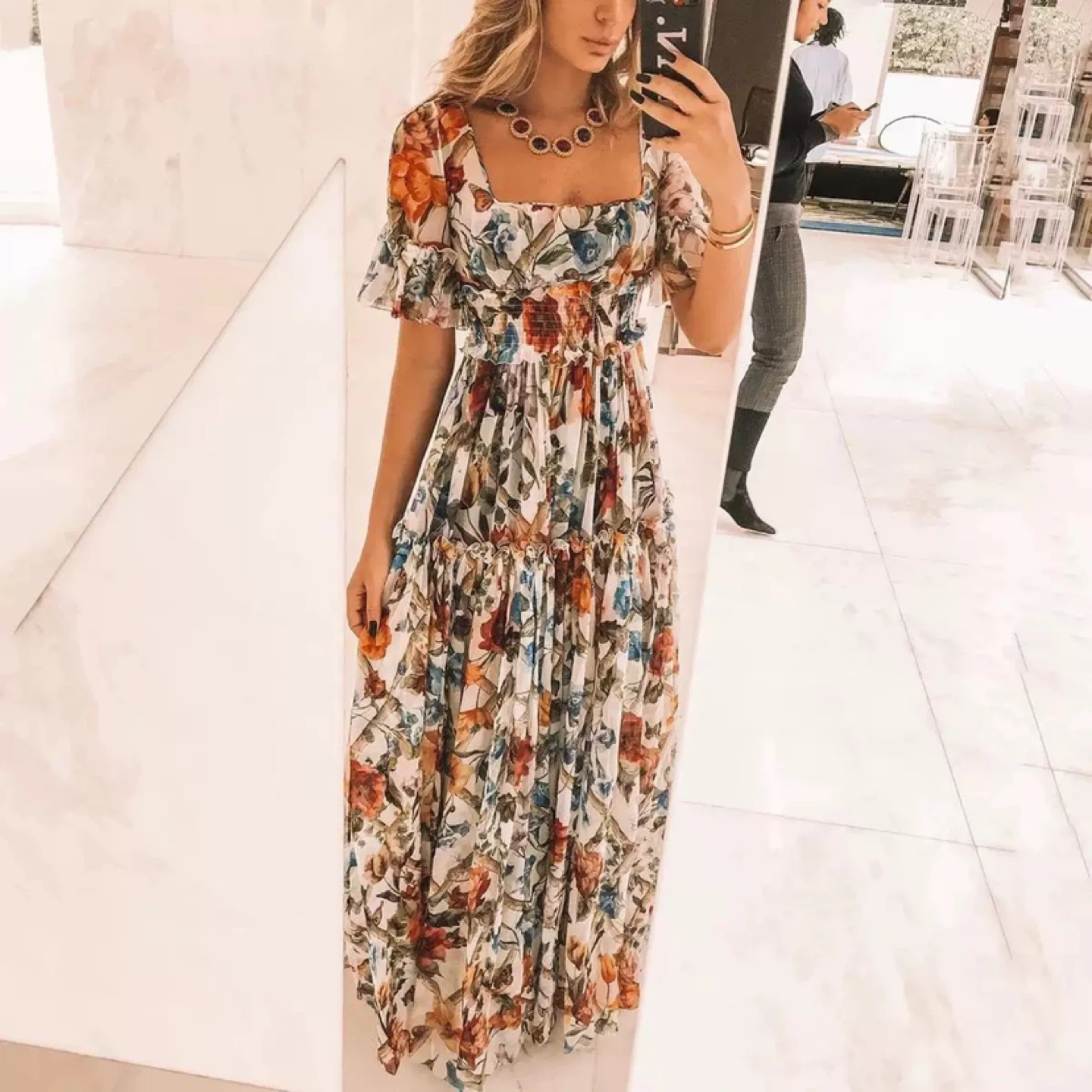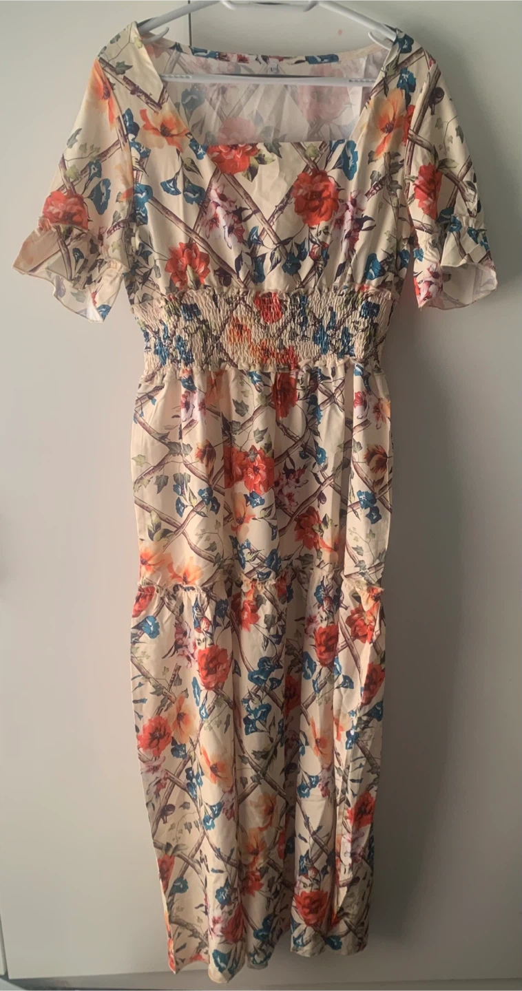 Selling a beautiful floral maxi dress! It features a square neckline and an elasticized waist for a comfortable fit. The dress has a lovely pattern with red, orange, and blue flowers on a light cream background. Perfect for summer days or special occasions!
