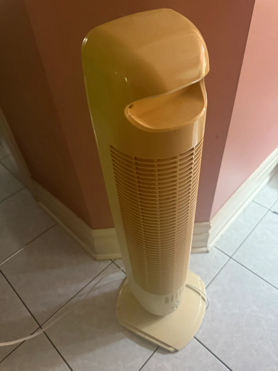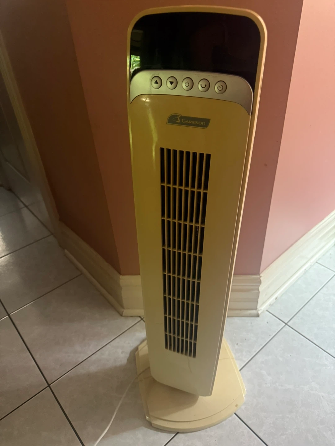 1000+Keep cool with this Garrison tower fan! It's in great functional condition and ready to help you beat the heat. Has yellowing from sun. Perfect for any room in your home!