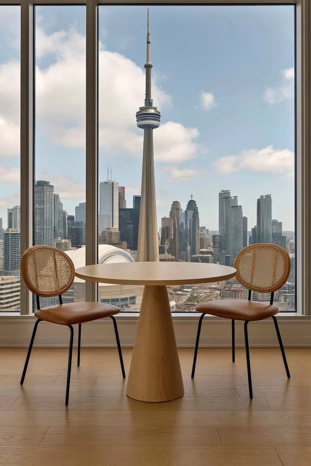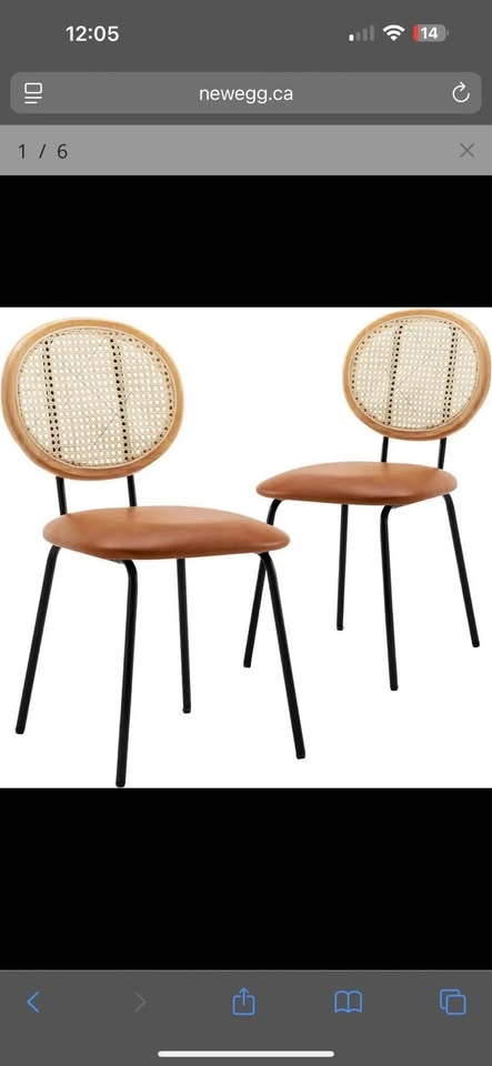 A pair of brand new in box rattan-style chairs in a rich whiskey brown colour. Sleek, modern design with a woven back and cushioned seat β perfect for a condo, kitchen island, or bar space.