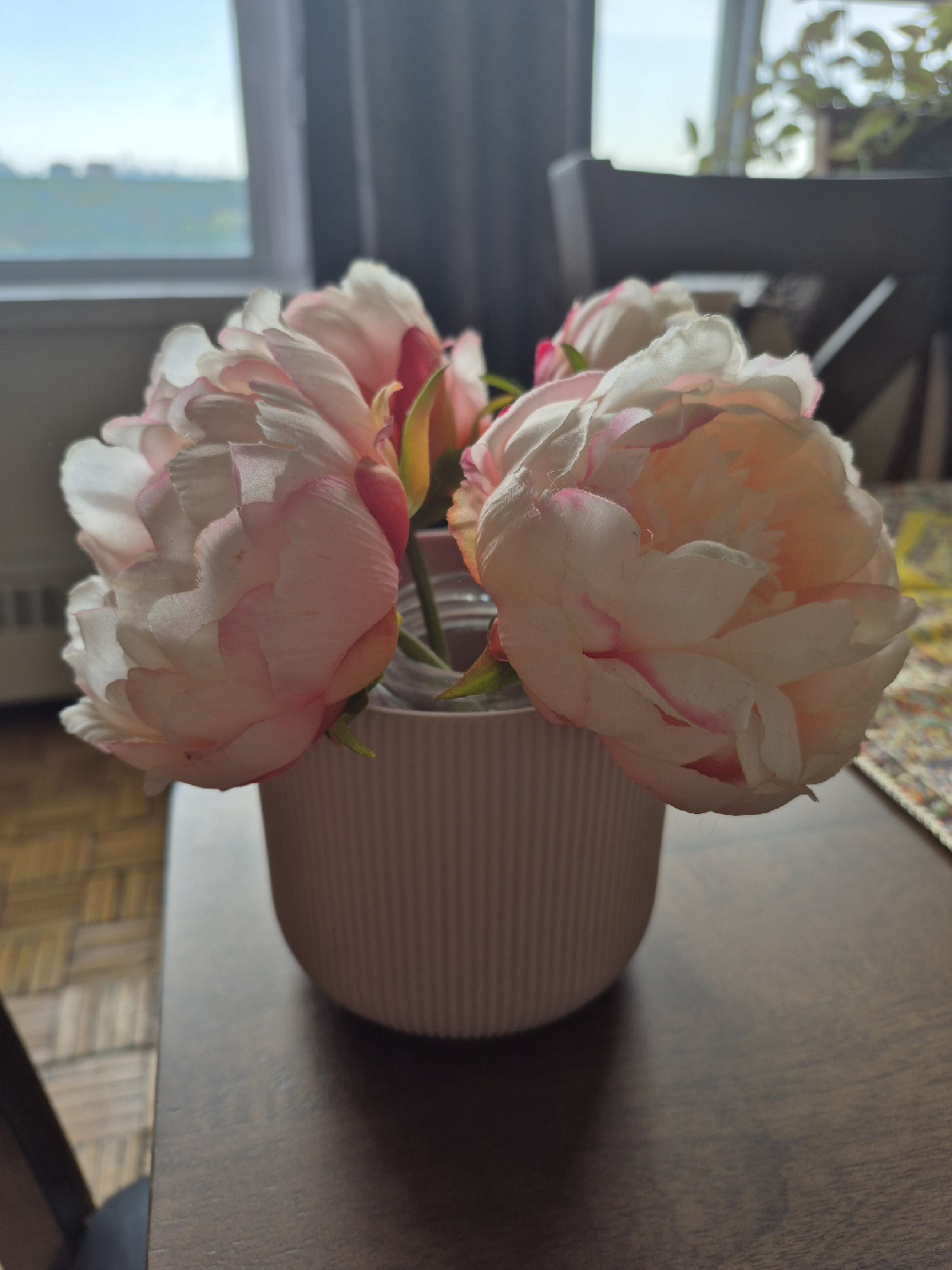 These beautiful artificial faux peonies are perfect for adding a touch of spring to your home. They come in a cute, light pink vase. They're in great condition and would look lovely on a table or shelf