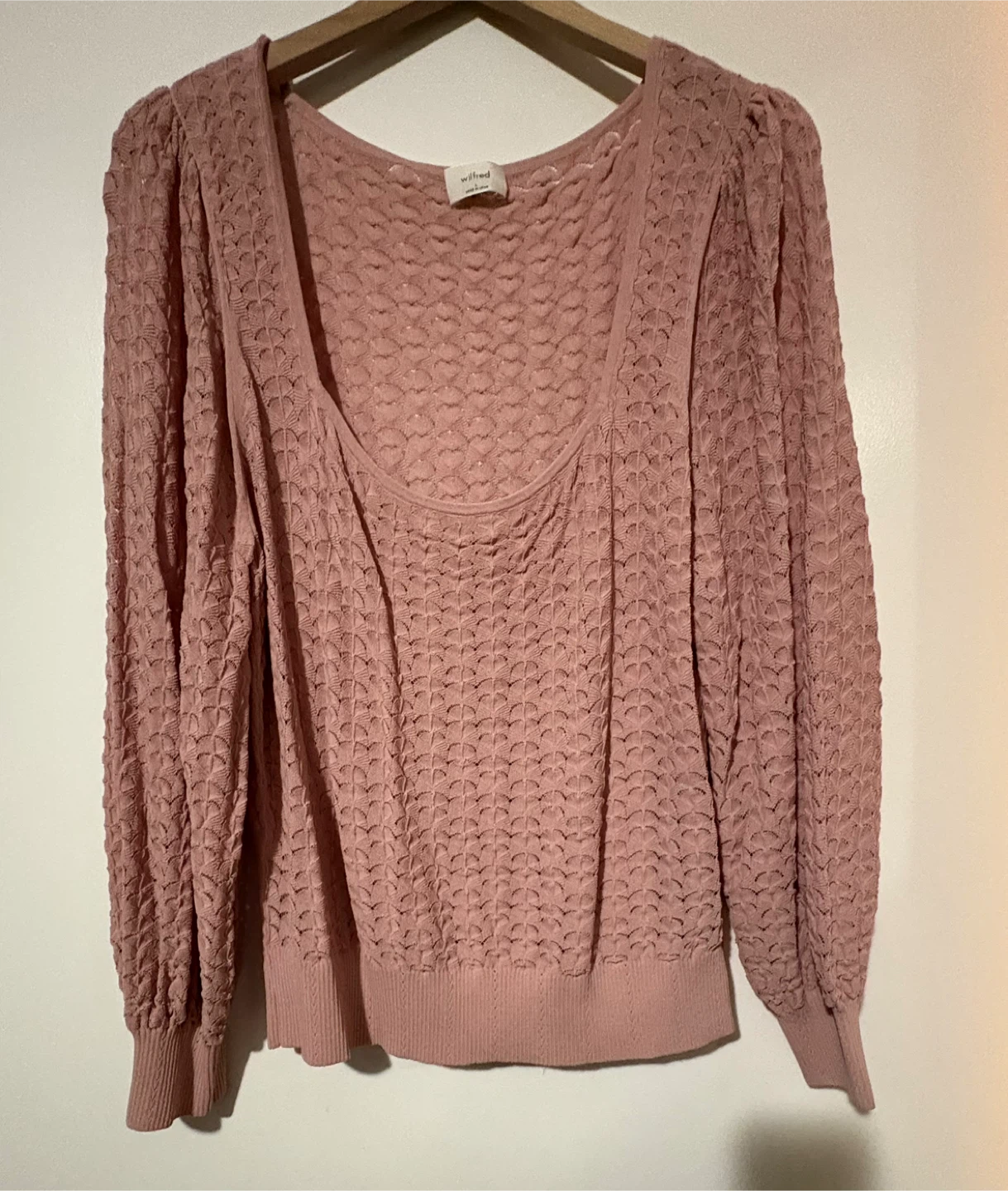 Here's a lovely Wilfred Free knit sweater It's a beautiful blush pink colour and features a unique knit pattern. Perfect for layering or wearing on its own!