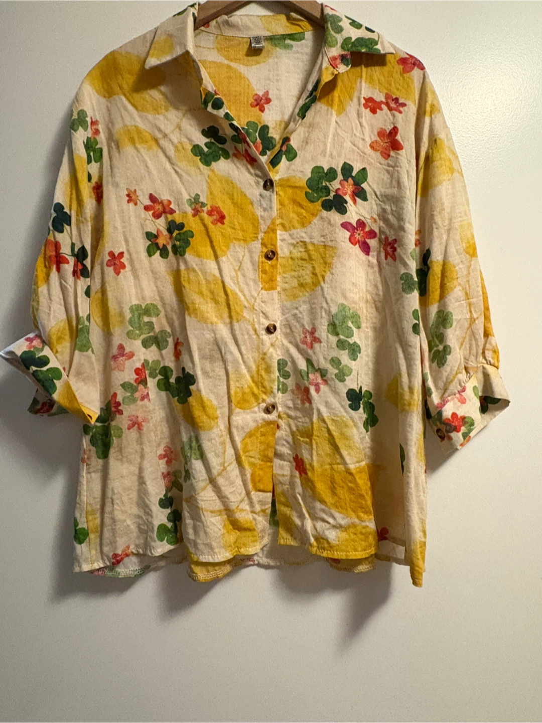 Here's a cute floral button-up shirt! It features a yellow and cream colour palette with a fun floral pattern. Perfect for adding a pop of colour to your wardrobe