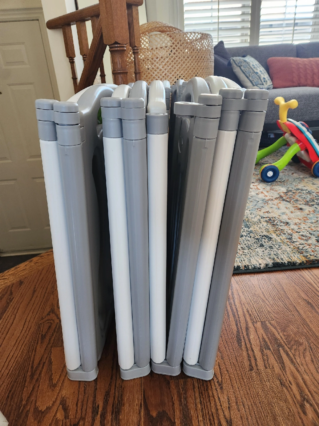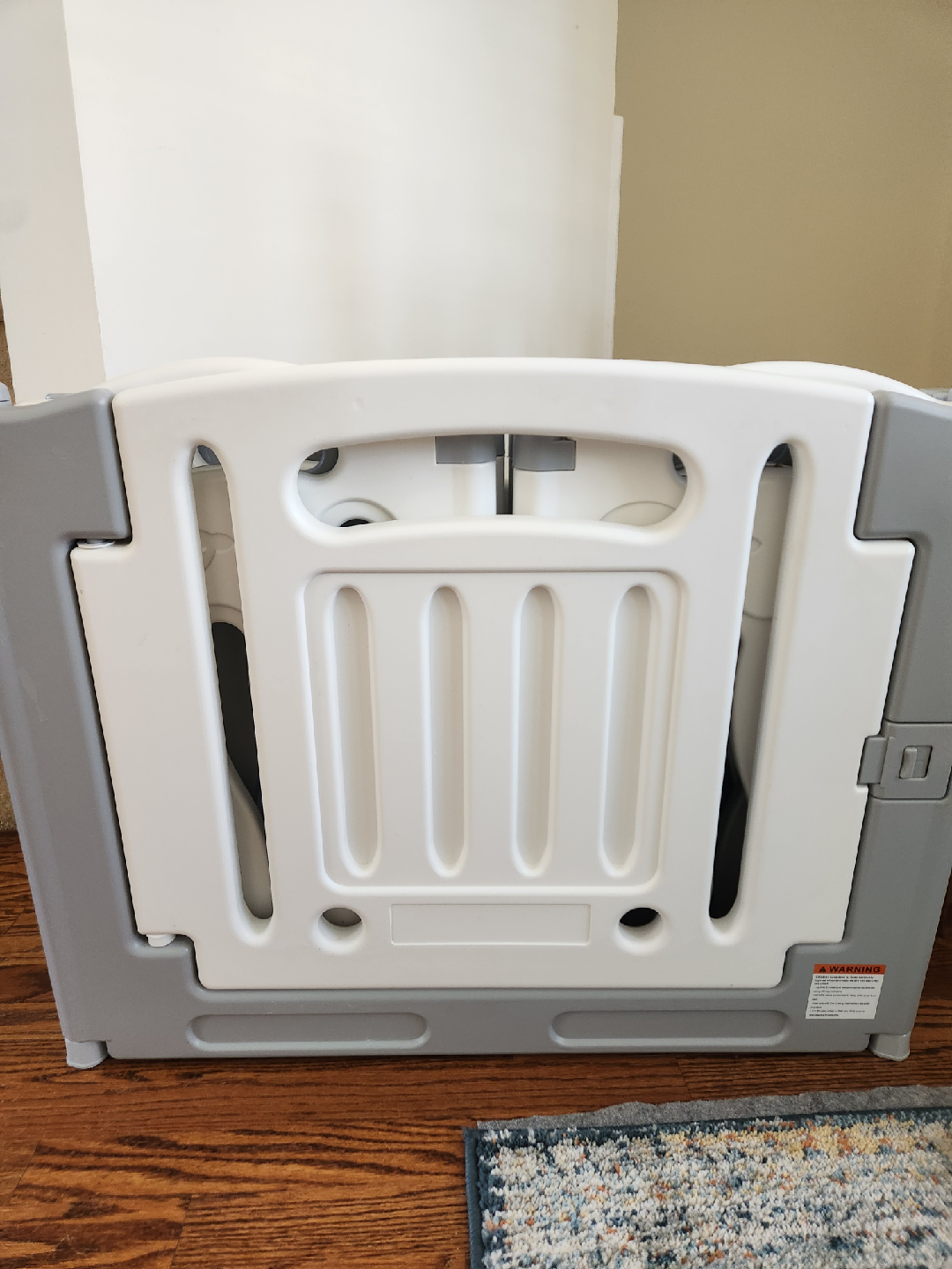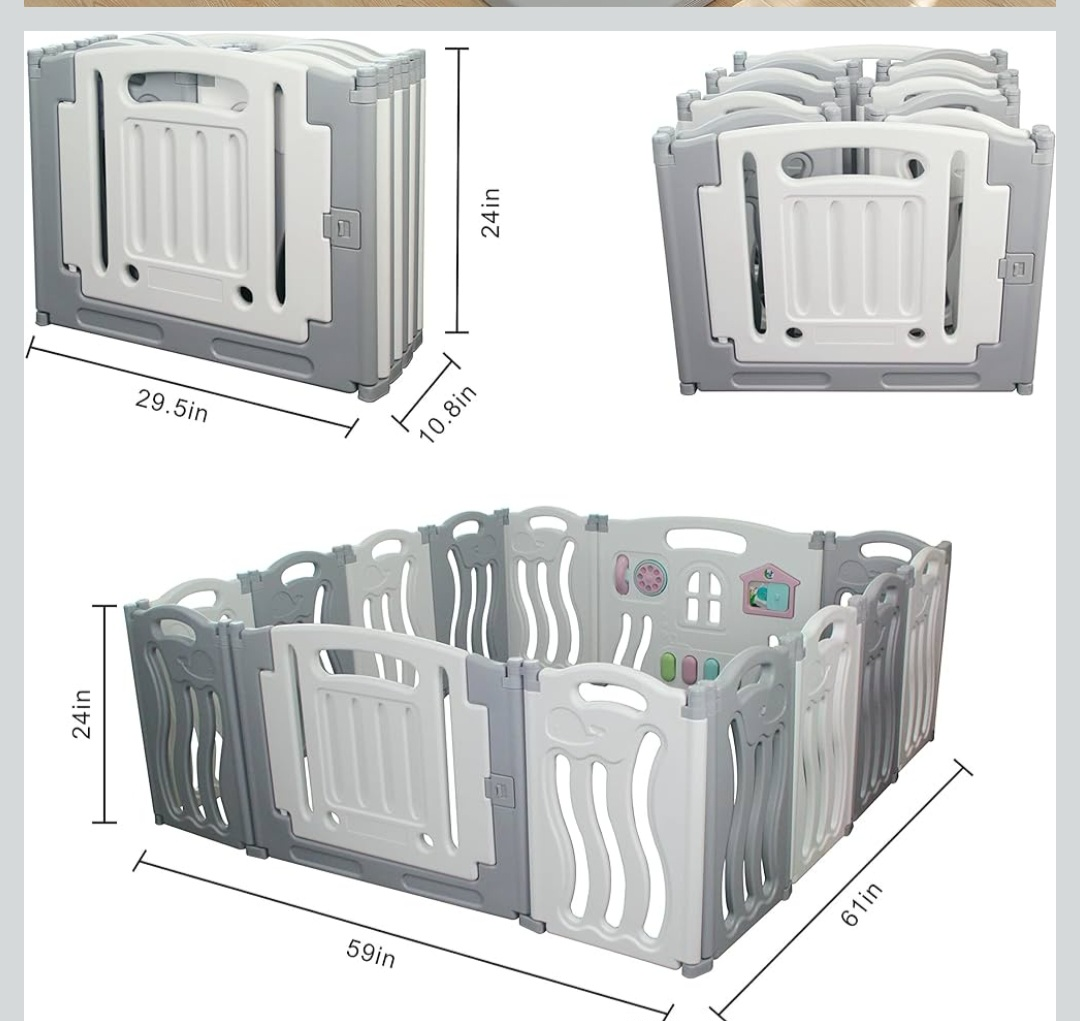 Dimensions: Panels are ~29.5” wide, 24” high. When fully assembled, it creates a play area of approx. 59” x 61”.