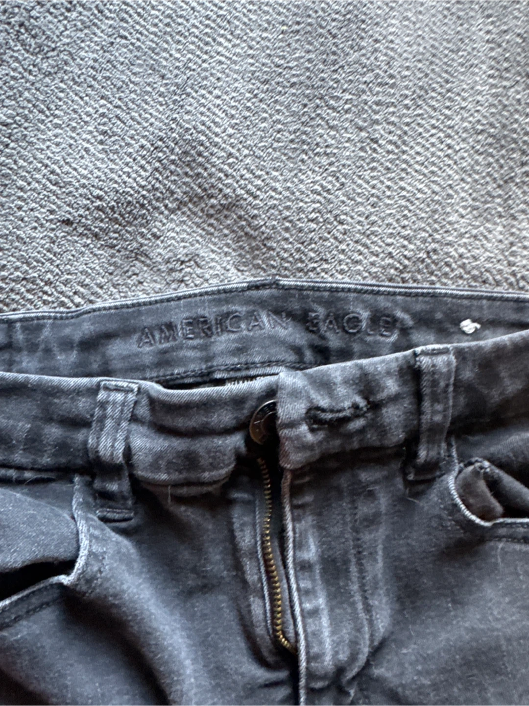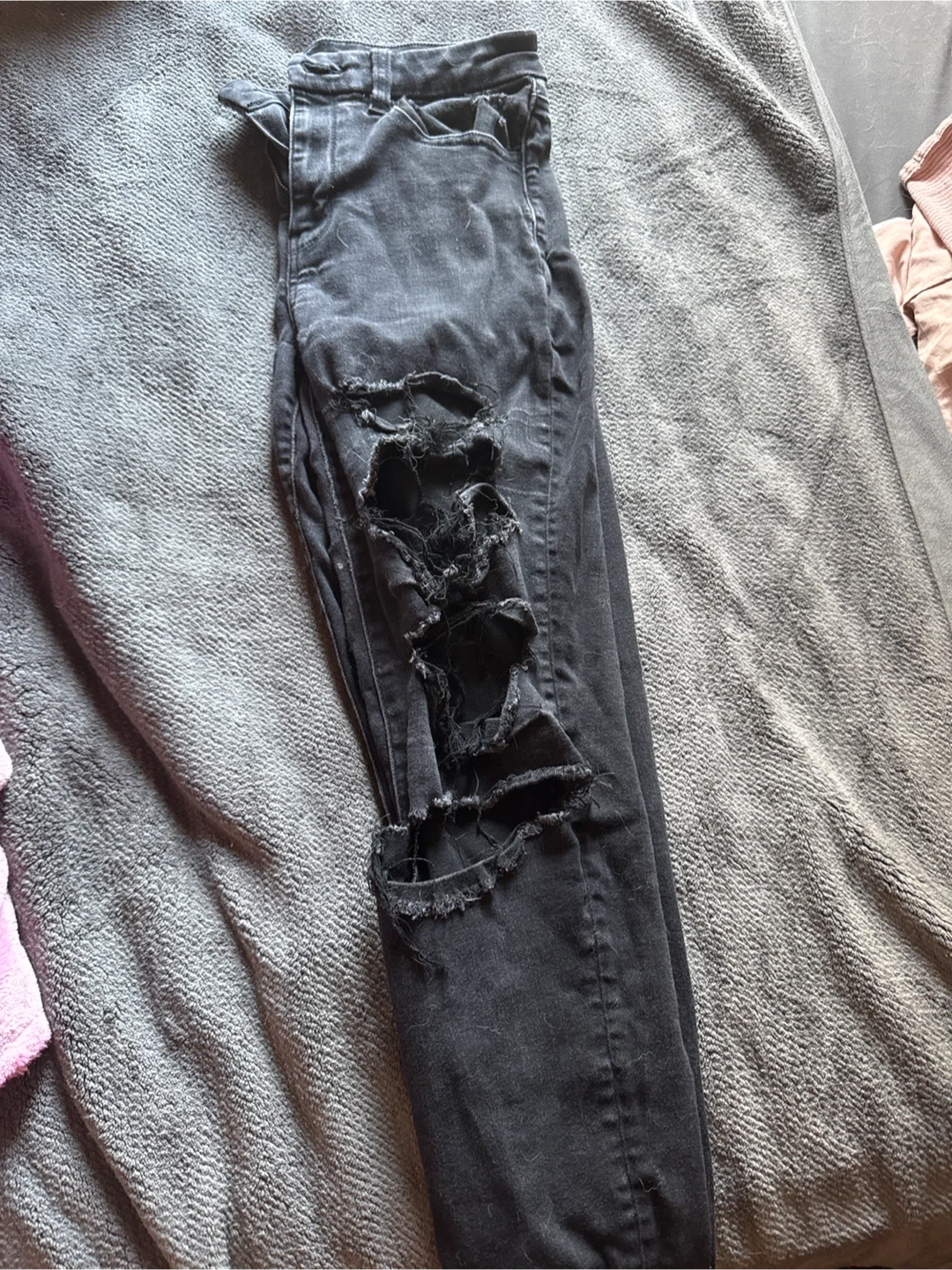 Selling a pair of American Eagle black ripped jeans. They are in good condition and have a stylish, distressed look. Perfect for a casual outfit!