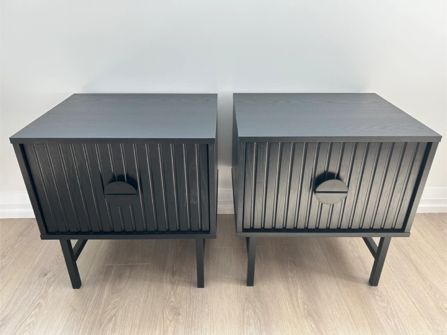 144Selling a set of two stylish black wood nightstands, like new. The nightstands feature a unique design with a fluted drawer front and a circular handle. Perfect for adding a touch of modern elegance to your space!