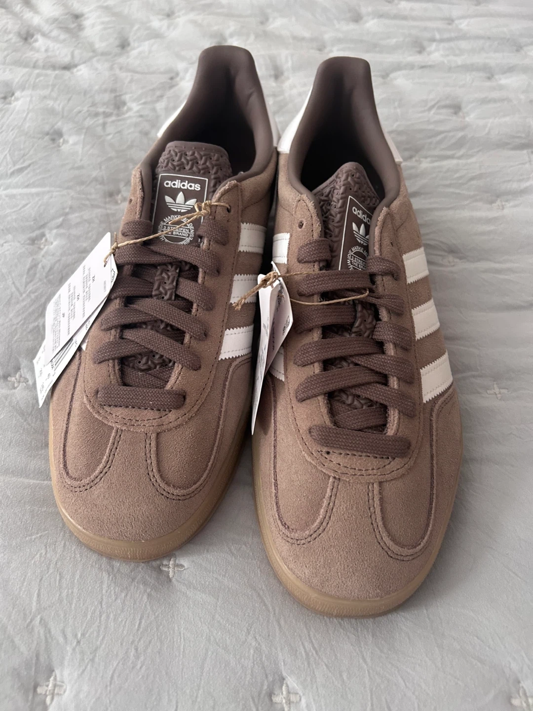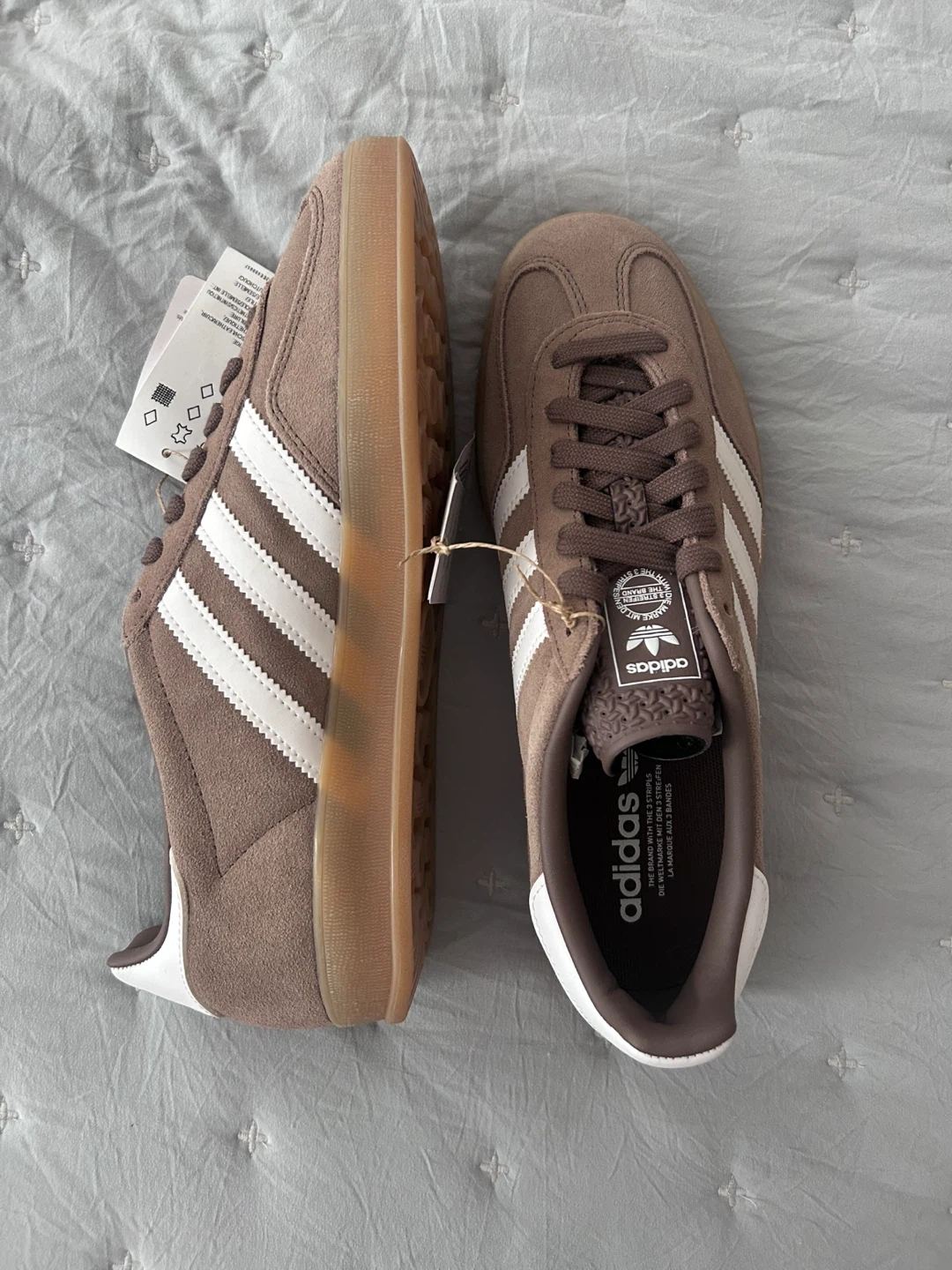 Selling a brand new pair of Adidas Gazelle shoes! These are a stylish brown suede with the classic three white stripes. They're in perfect condition, never worn and ready for a new home