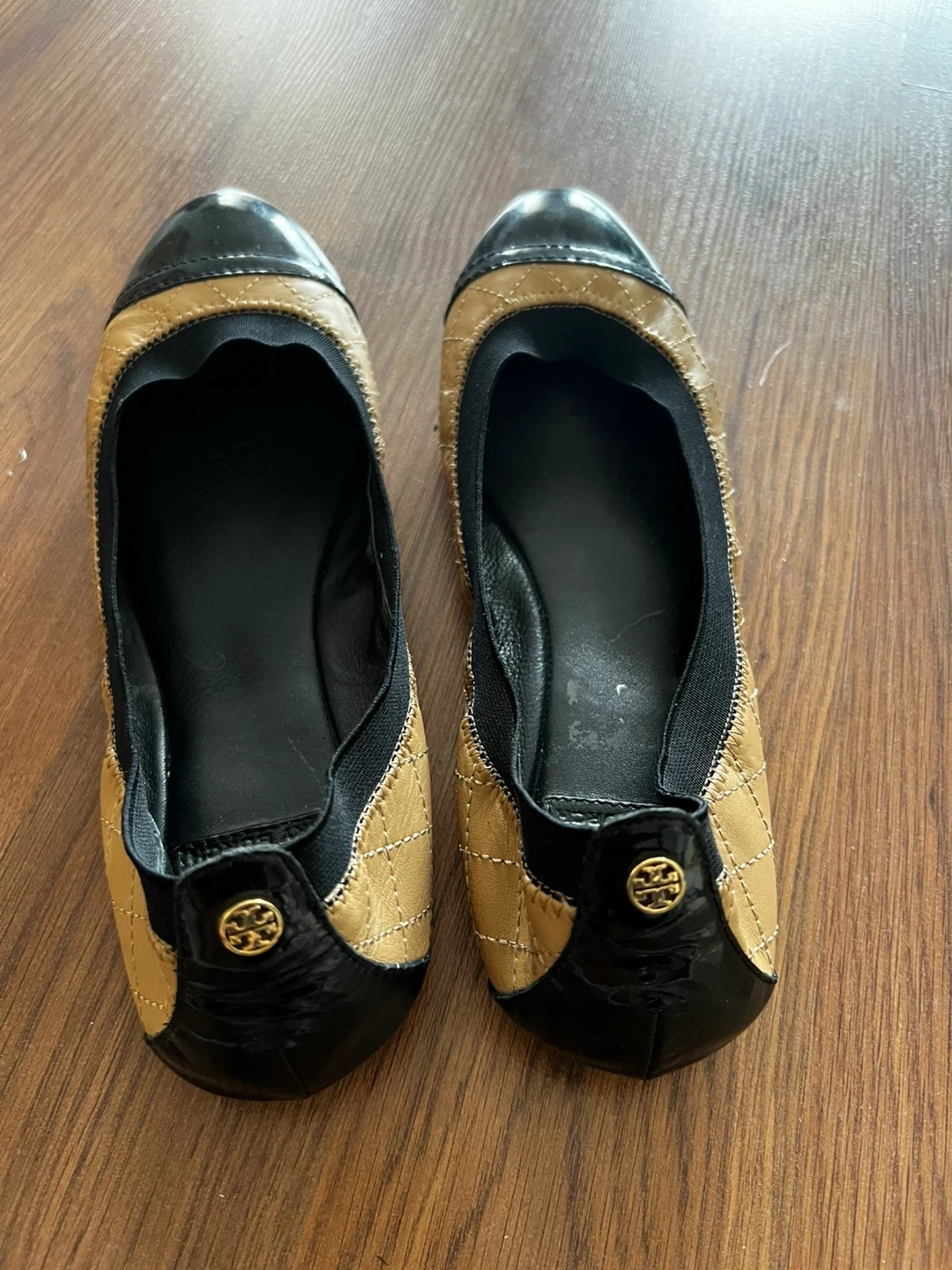 They are in great condition and have the classic Tory Burch logo on the front and back. The flats are a combination of black and tan, making them versatile for different outfits and seasons.