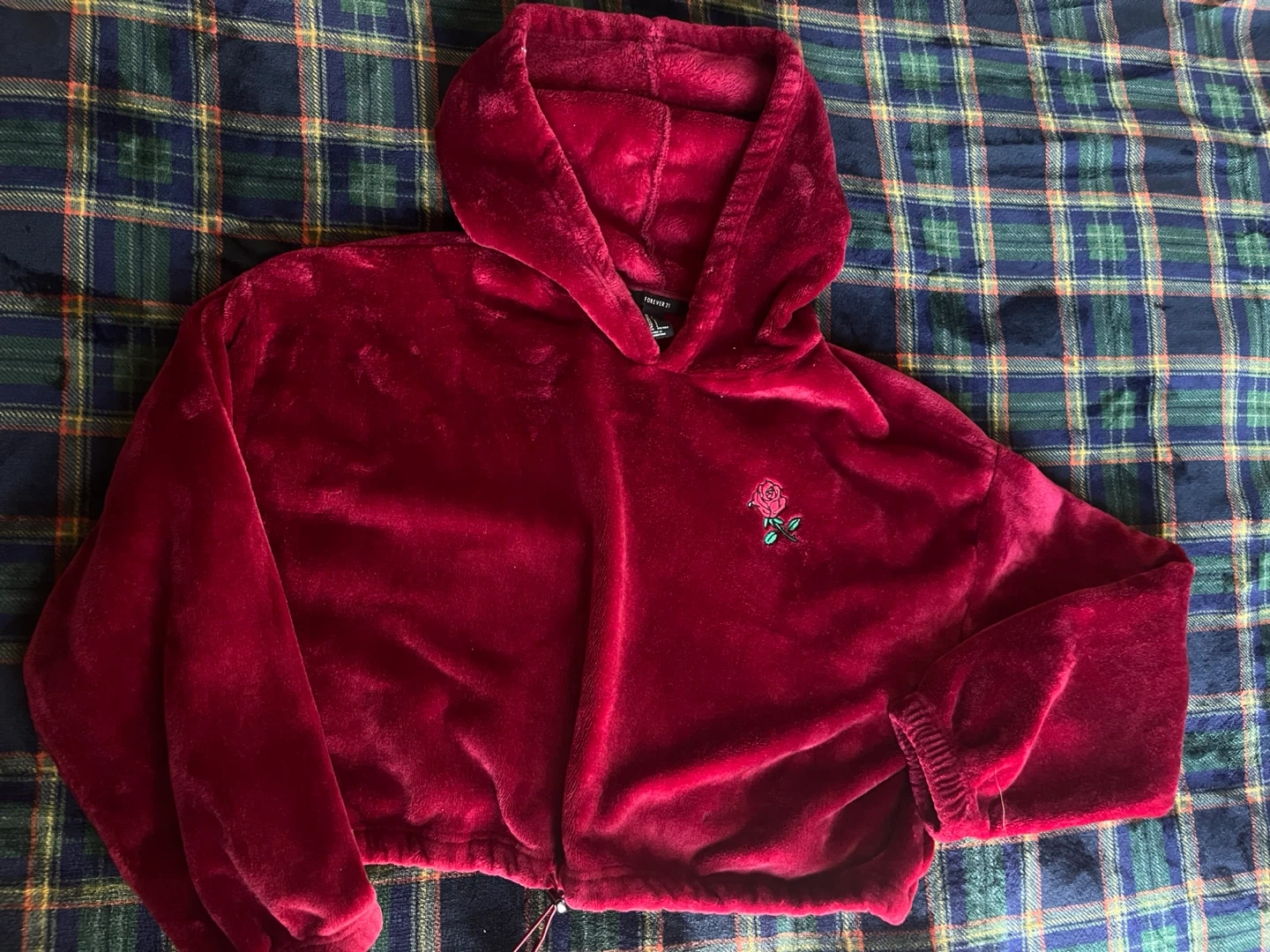 Cozy Forever 21 hoodie in a lovely burgundy colour! It's super soft and features a cute rose embroidery. Perfect for adding a touch of warmth and style to your wardrobe
