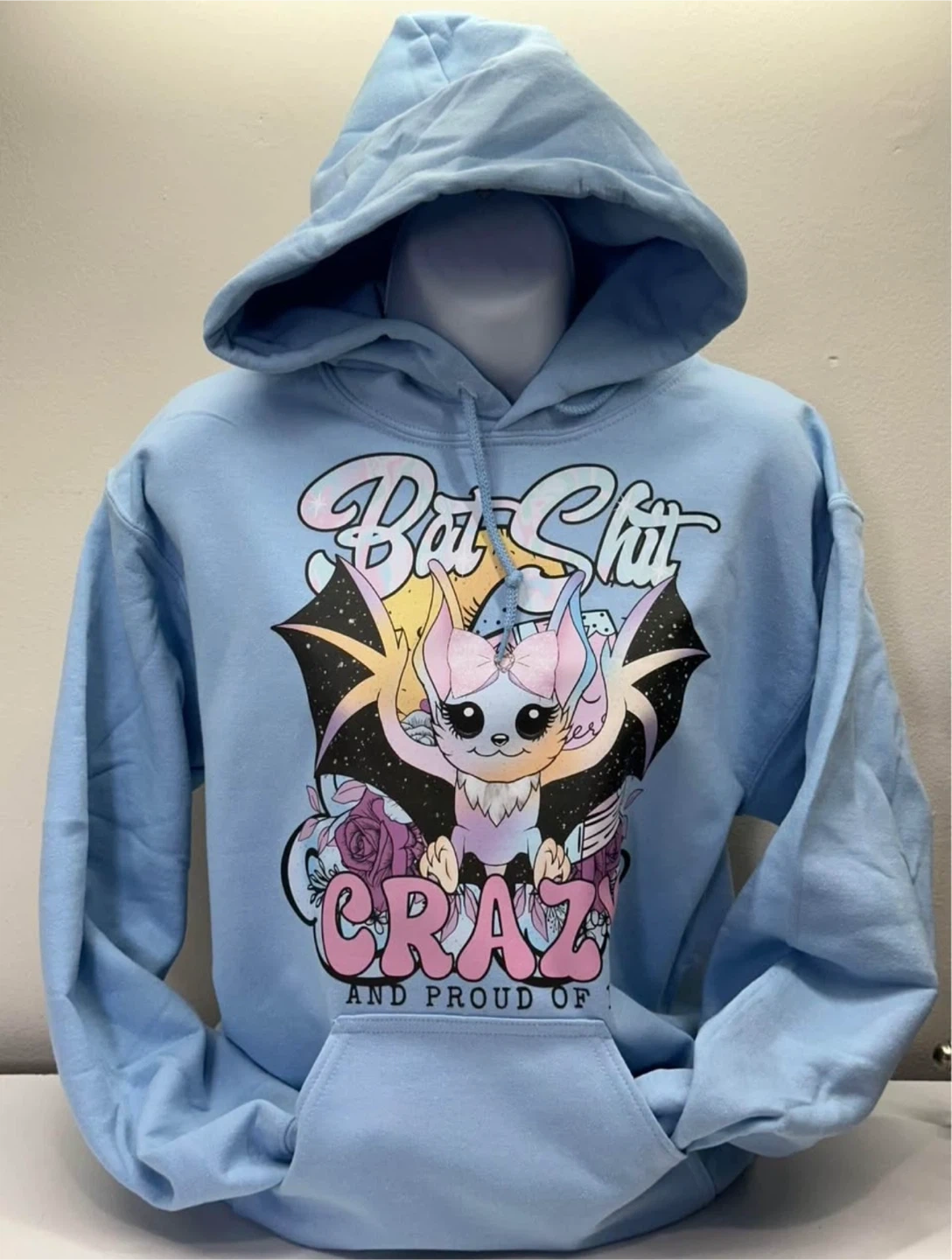 Selling a light blue hoodie with a unique design featuring a cartoon bat and the words "Bat Sh!t Crazy and Proud Of". It's in great condition and ready for a new home! Perfect for anyone who loves fun and quirky clothing