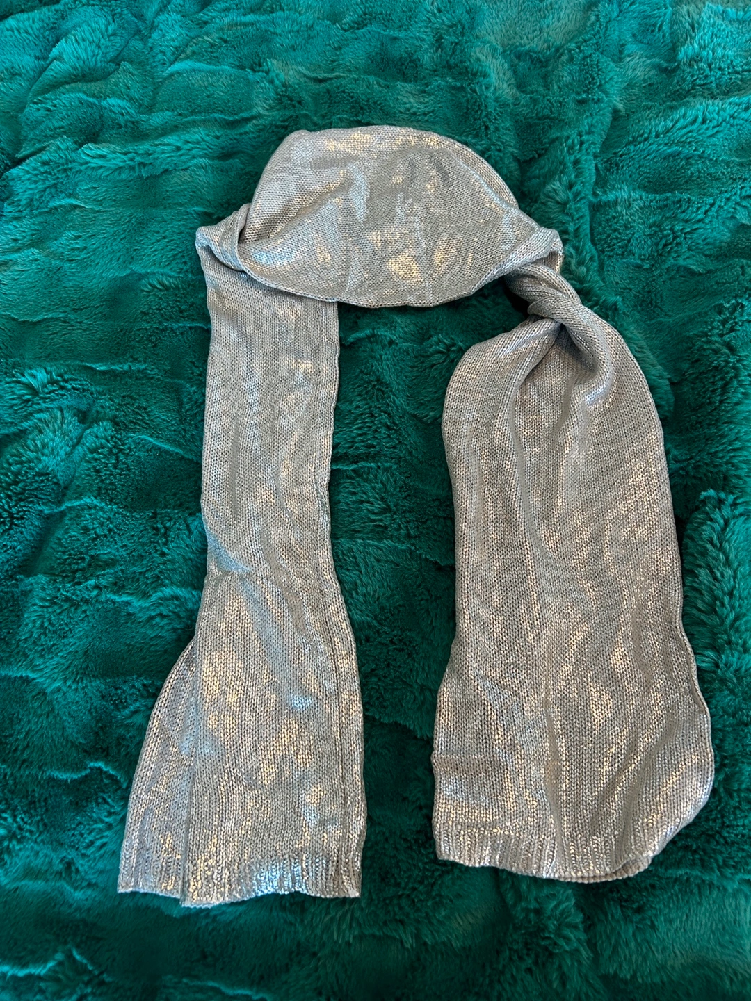 Selling a lovely silver knit scarf. It's in great condition and would be a stylish addition to any outfit! The material is soft and comfortable, perfect for keeping warm on chilly days